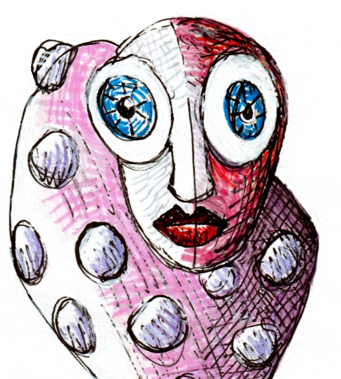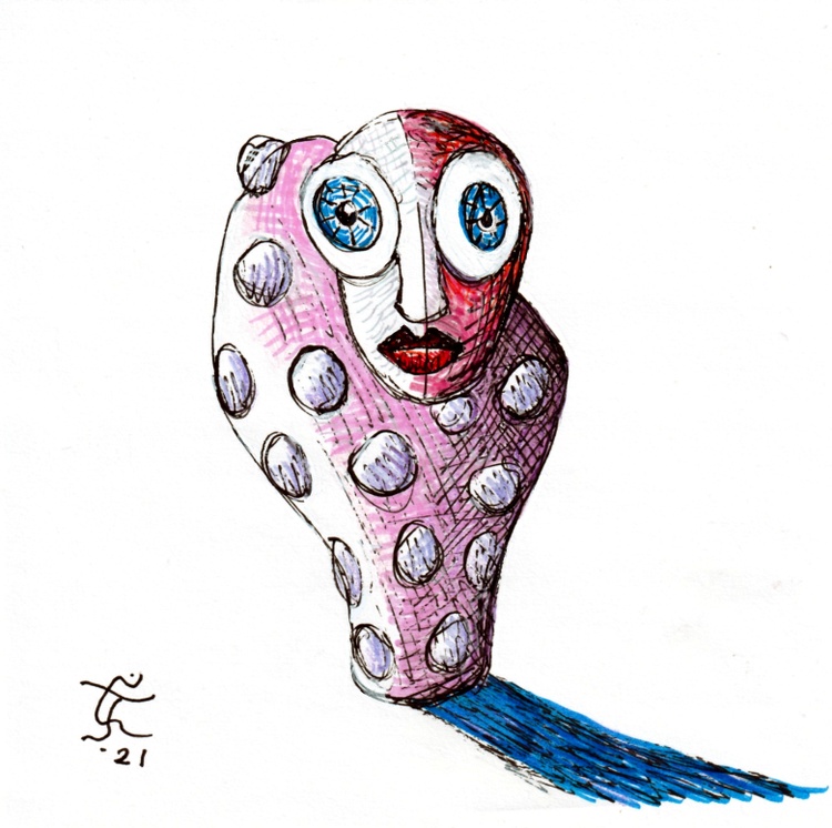 The pox is defined as any of several viral diseases producing a rash of pimples that become pus-filled and leave pockmarks on healing. The two big ones, historically, are related to small pox and syphilis. I think the latter was called 'The Great Pox' though, when you read about the symptoms and what it ultimately leads to, I don't find anything too great about it. I was trying to design a new sculpture with lighted eyes and 'pimples' that would be made of a translucent material with LEDS inside. I thought it might make an interesting Halloween piece without being stereotypical. This is a 9 by 8 inches gel pen drawing on lightweight acid-free paper. It's just Original Jones Art trying to light up his own ideas here in northwest Austin, Texas.