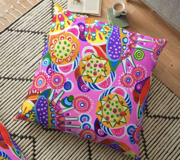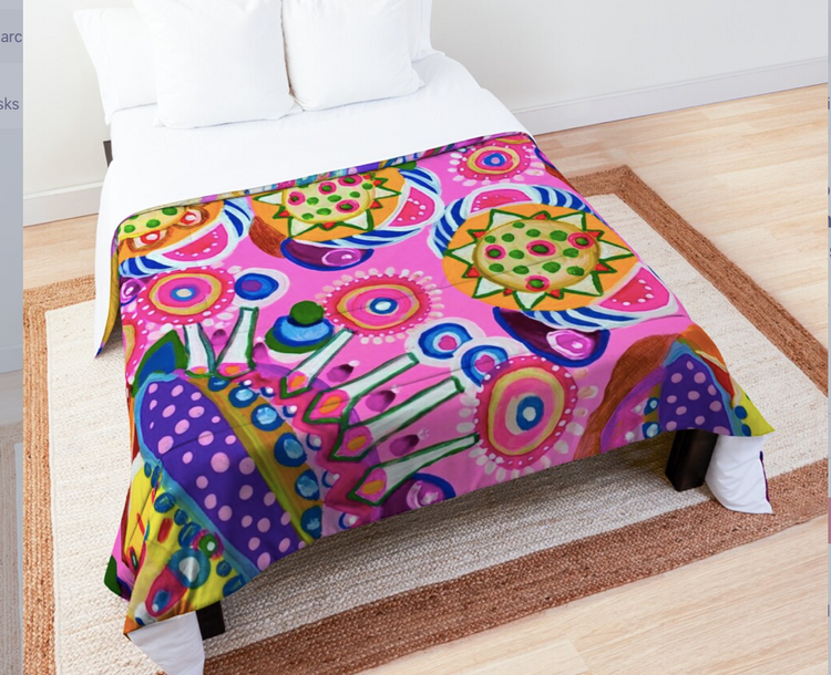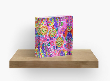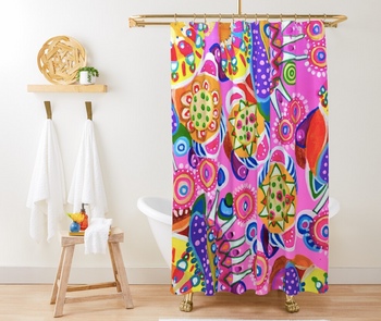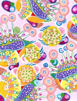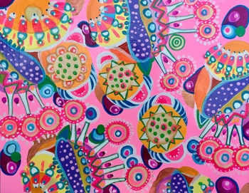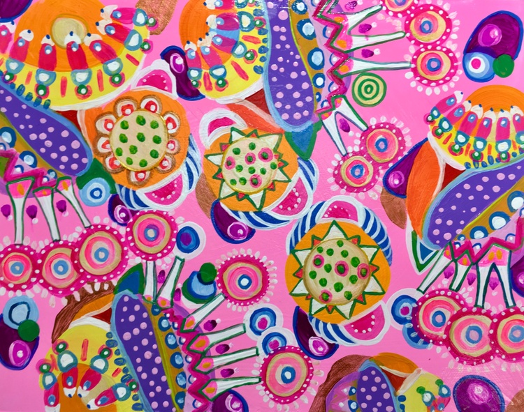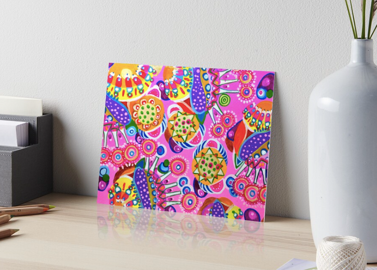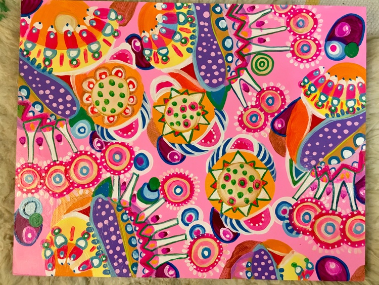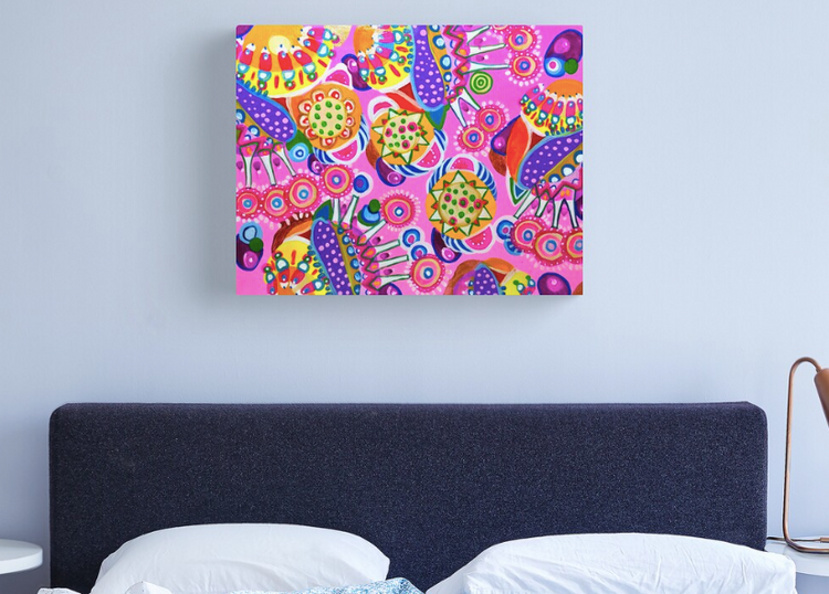I was very inspired when I painted this artwork. I wanted to create a wonderfully colorful collection. While painting it I was thinking about final products. My idea was to create a really colorful interior decoration. When making a new design I try to imagine how it will look in big size. The original artwork is small, the image is subconscious. I have used pink background and only colorful shapes. I avoided using black to let my artwork stay really colorful. It took me 12 hours to paint this artwork. The original is intended to be a source for further designs. I like to have my works printed on a large scale without spending one week painting them. By making small artworks I save a lot of time. Art is my natural need to express myself.