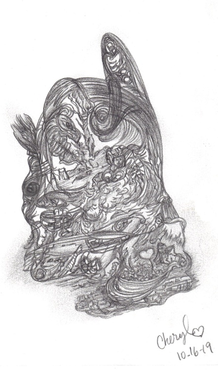 Channeled Drawing Channeled Message Dated 10.16.19. Soul is breaking out of this body, shedding, breaking. All these layers are intertwined, layers of lifetimes. The false foundations crumbling into pieces. A storm brings in heavy rains, very rocky waters. It was stormy and dark in this world, where one cannot speak nor allowed to speak the truth. There is a bandage or wound above eye with beautiful feathers. Prominent Message - Not being able to speak. But the heart came out to shine and the birds to sing. No longer bound, a flower opens from mouth, very precious. Feathers become more beautiful and fuller, coming into fullness. Heavy energies transmuting to light. A gem is being given. You are loved and can trust this higher love is true. A New Kind of Heart - In a New Kind of World - HIGHER LOVE