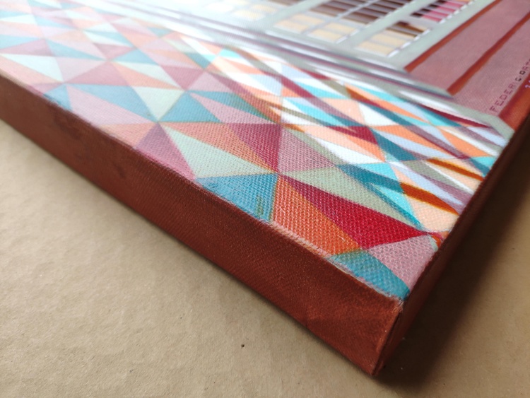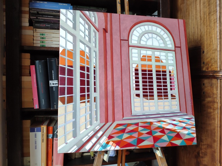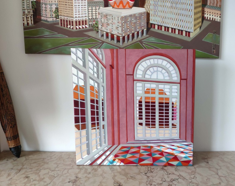An original piece from the series "Abandoned rooms", oil on canvas, 50 x 50 cm, 2021. Original sold. This series of paintings was inspired by the metaphysical landscapes of De Chirico. I have always been fascinated by their clear vision of the architecture, with the precise design of the shadows, almost anticipating the modern use of three-dimensional modeling software. In the way I feel, however, more introverted and almost unsociable, the outer space is transformed into a closed one, private and protected, from which the human presence has totally gone away. In those rooms then, it may happen that some strange objects and some unexpected decorations appear, suggesting that the person who lives there has overcome the lack of relationship to the outside world with the richness and complexity of his inner world.