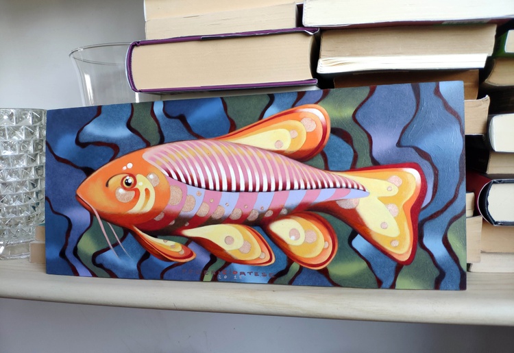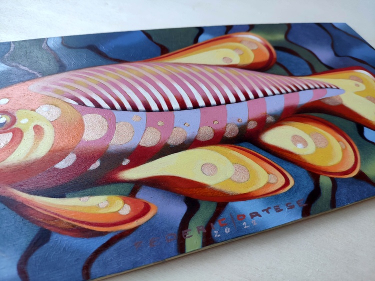 An original piece from the series “Small fish”, oil on wood panel (plywood), 35 x 15 cm. I open my eyes underwater. The contours of objects are blurred. The contrast between the colors is softened by a veil that makes everything more uniform. The refraction of the light is influenced by the ripples in the surface of the sea. Flashes of light dance on things, concentrating and dispersing, giving the surface of the objects it stands on the impression of velvet. The fish move slowly among the seaweed, all things appear together, faded and dissolved into one another. Other features: Medium & materials: oil on wood panel (plywood) Thickness of the panel: 0.5 cm Finishing: protective varnish (transparent mastic paint) Location and year created: Turin, Italy - 2022 Certificate of Authenticity: included, with signature of the artist on photograph Signed: on the front, bottom center In case of sale shipping is worldwide free.