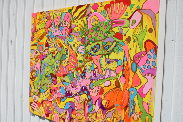 The use of acrylic paint allows for rich, saturated colors and a smooth, vibrant finish. The artist’s skillful application of paint brings out the luminosity and depth of the colors, creating a textured surface that engages both the eyes and the hands. The detailed patterns and forms invite viewers to explore the painting repeatedly, discovering new details with each viewing.