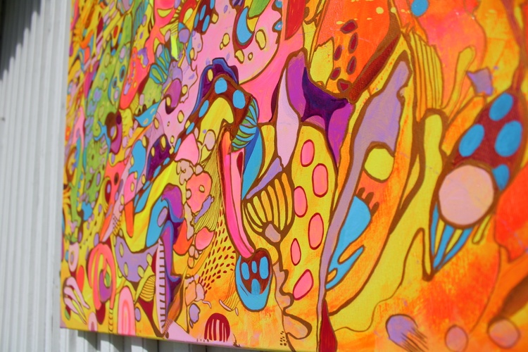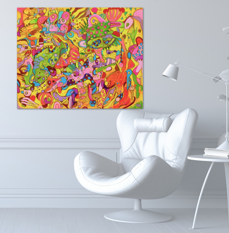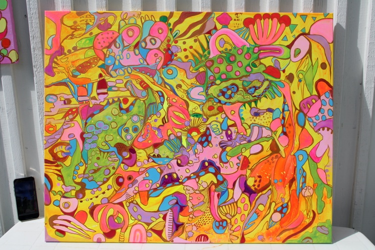 At the core of "Radiant Reverie: Symphony of Colors" is its dynamic and fluid composition. The artist employs a variety of abstract shapes, including spirals, dots, and amorphous forms, that flow into one another, creating a rhythmic and harmonious dance across the canvas. The bold, contrasting colors enhance the visual impact, making each element stand out while contributing to the overall cohesion of the piece. The background, a blend of softer and more intense shades, provides a serene contrast that allows the foreground elements to pop, adding to the painting's depth and complexity.