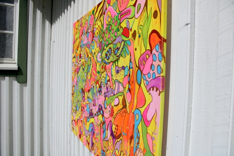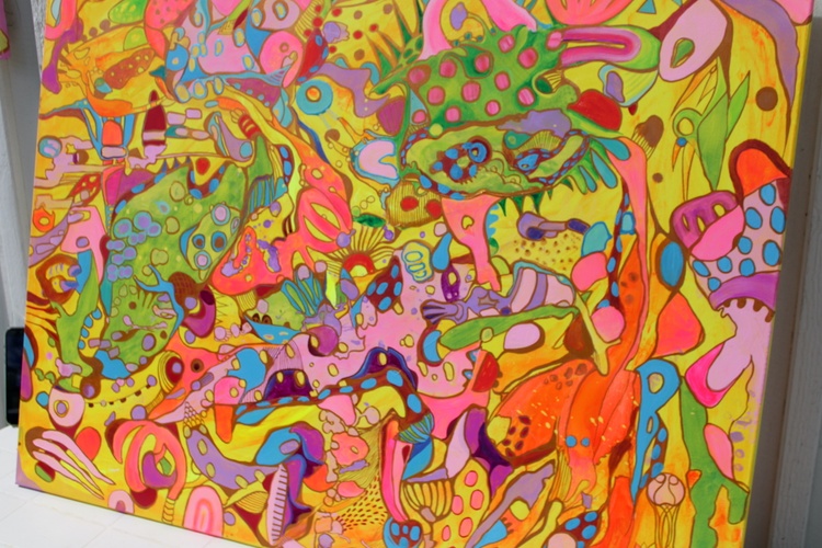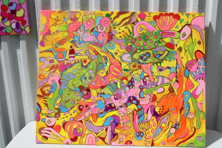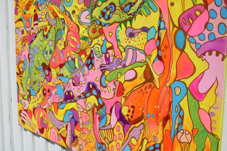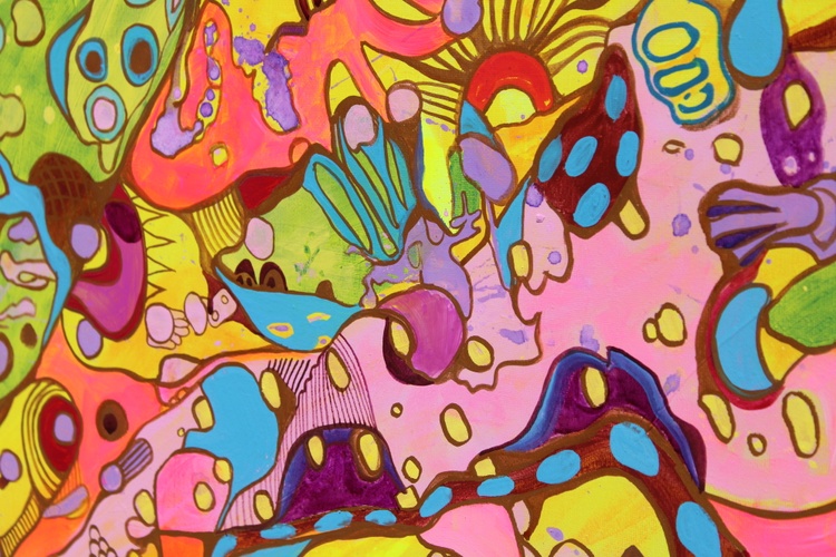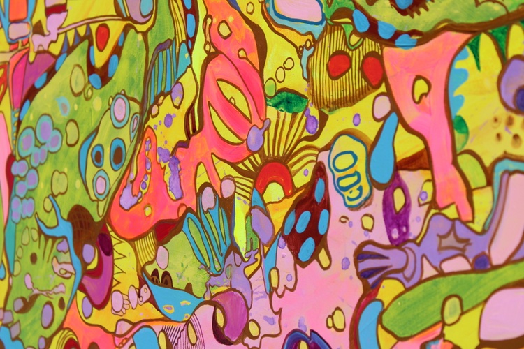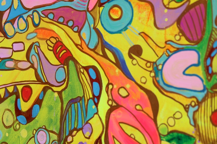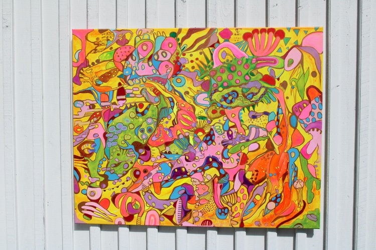The painting features an explosion of bright and bold colors, including pinks, greens, yellows, blues, and purples, intricately layered and interwoven to create a rich tapestry of shapes and patterns. The abstract forms are a delightful mix of geometric and organic shapes, blending seamlessly into a harmonious and visually stimulating composition. The interplay of these vibrant colors and forms results in a lively and engaging visual experience.
