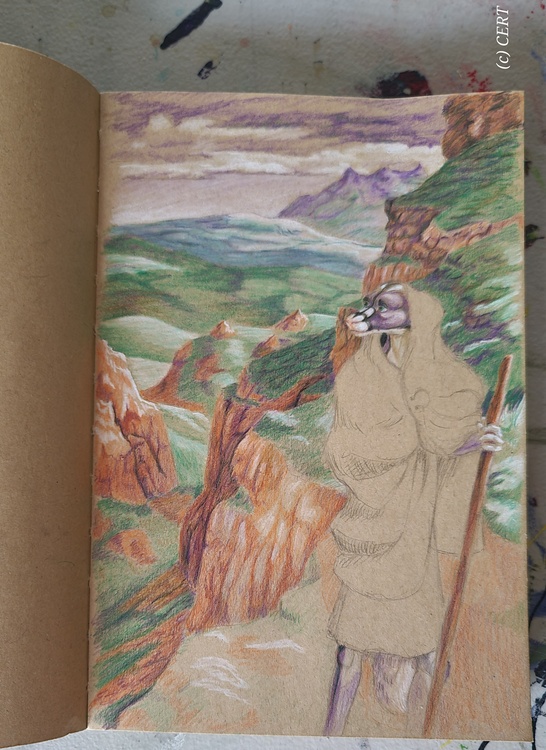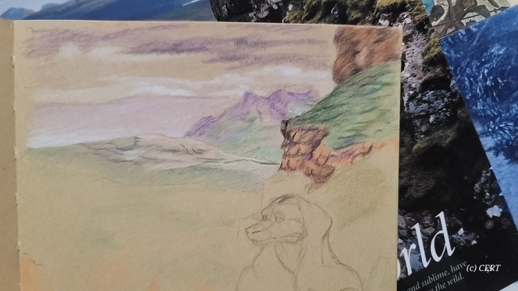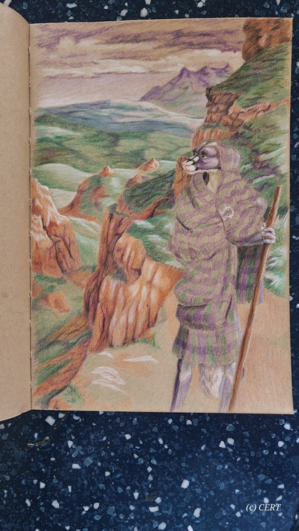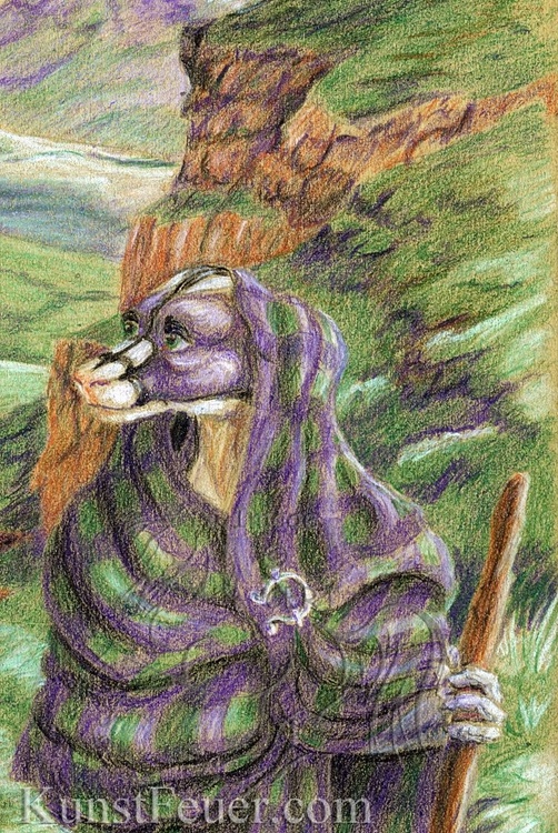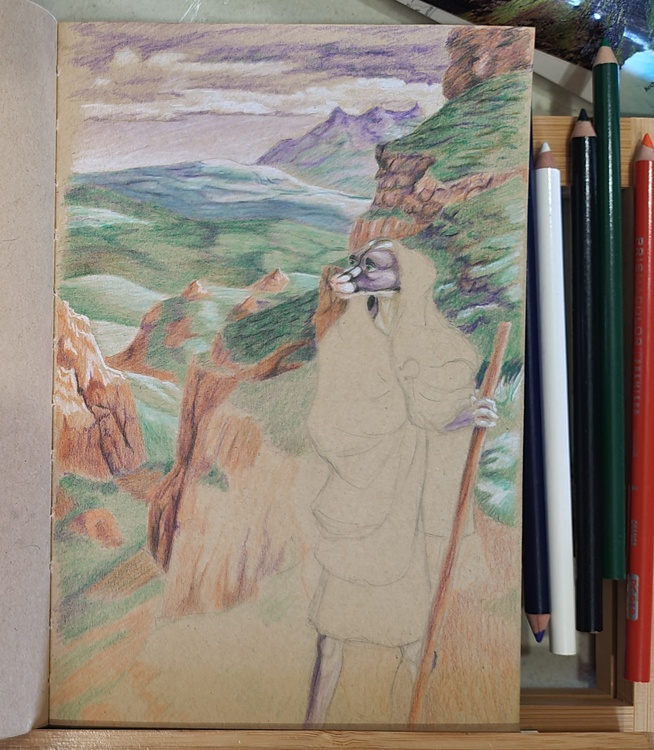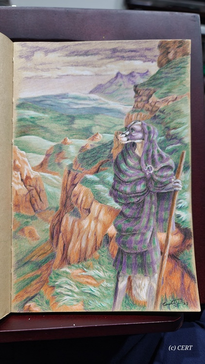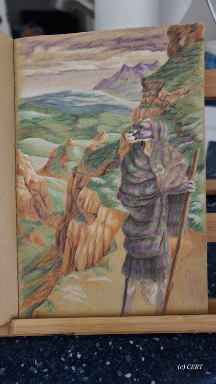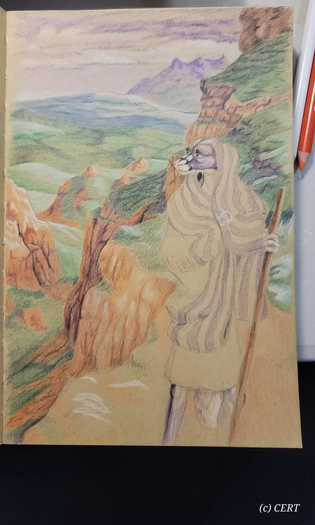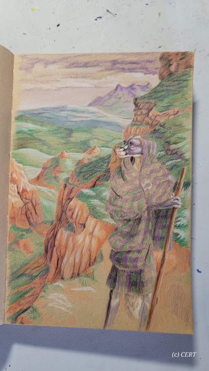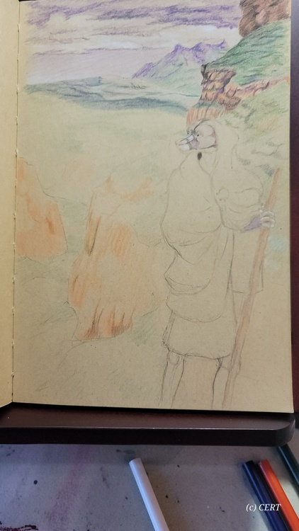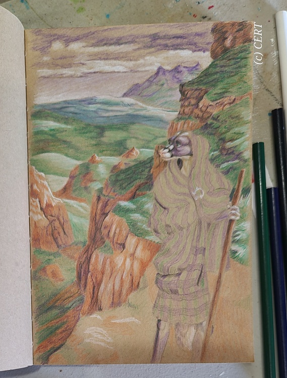 Dheillan hiking through the Anleizer mountains wearing the Brehtsoln's traditional Tseikohth (essentially a Great Kilt). He plays a minor part in the Forged by Fire trilogy prequel and tentatively shows up again in book two and three (because I can't write in chronological order to safe my life). This one was a challenge on multiple levels. The color scheme is triadic so I had just three colors (Green, Orange, and Violet) plus black and white. Unlike a triadic color scheme with the classic primary colors, there are quite a few limits as to what you can mix with the three secondary colors. Keeping things clear and interesting with such a limited palette kept me thinking hard about what I was doing. The other challenge was Dheillan's clothing. I avoided it until pretty much the very end. The last two color scheme drawings I just did a single color and no patterns on the Tseikohth, partially because it was easier with the limited palette for the monochrome and complimentary color schemes. This time I let myself be talked into plaid and my heaven, was it HARD. Trying to get the folds right and not getting lost between the two colors was extremely difficult, but I think it was worth it in the end. Prismacolor pencils on Soho Sketch Kraft paper, approx 5.6" x 8.26" Lemy'es, Klamon,