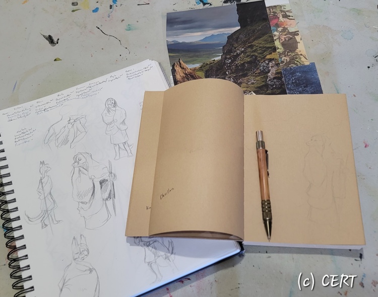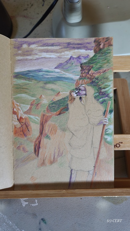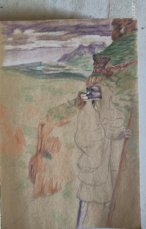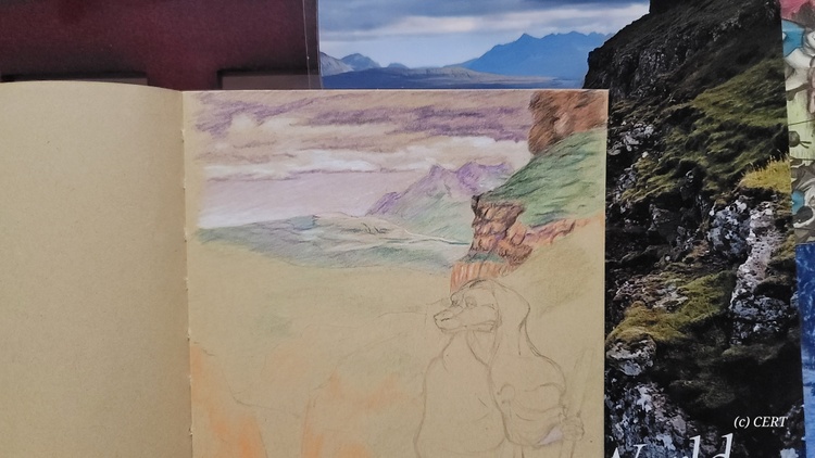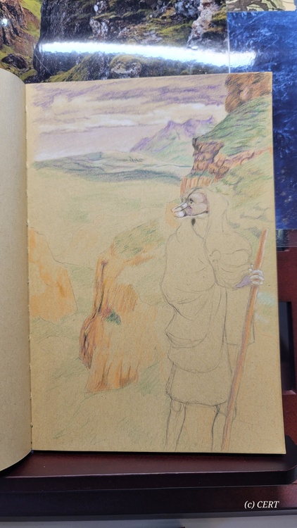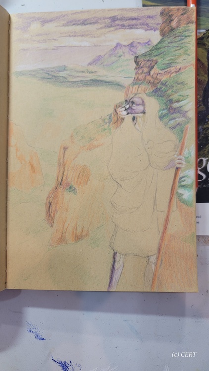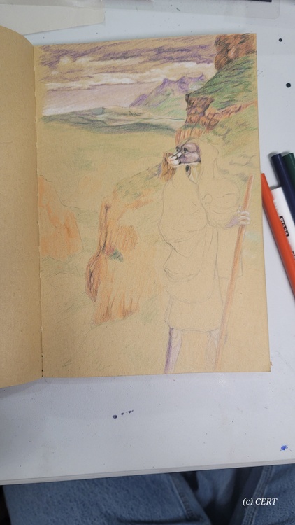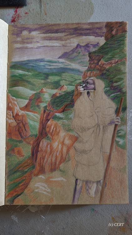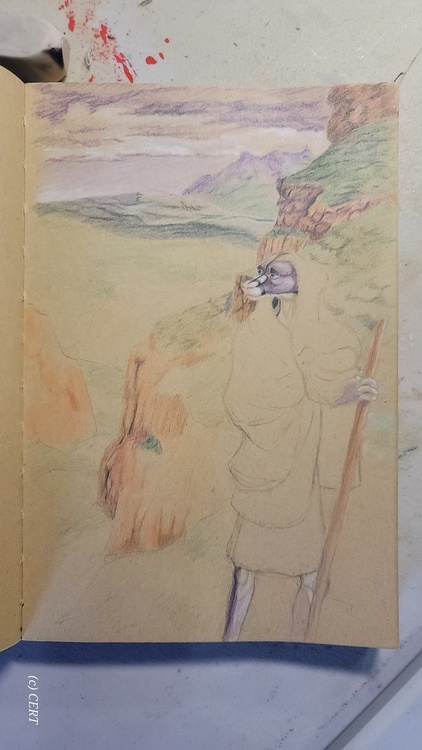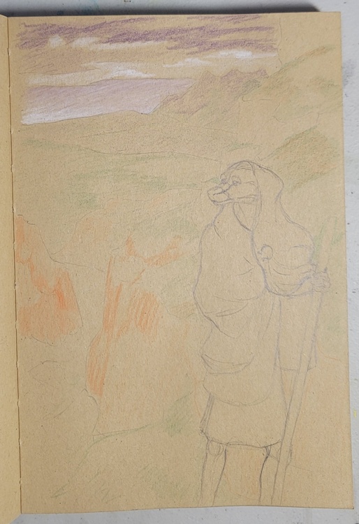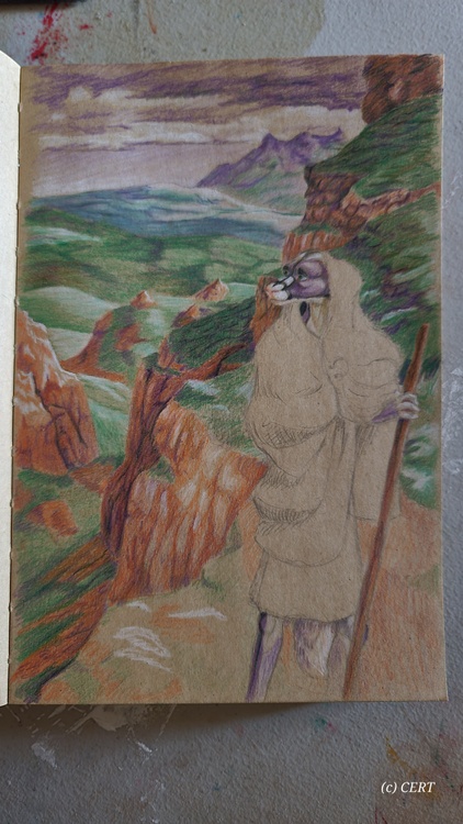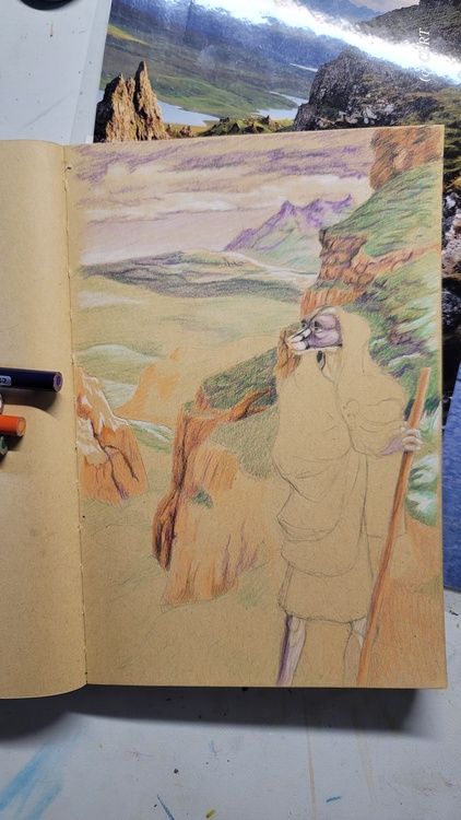 Dheillan hiking through the Anleizer mountains wearing the Brehtsoln's traditional Tseikohth (essentially a Great Kilt). He plays a minor part in the Forged by Fire trilogy prequel and tentatively shows up again in book two and three (because I can't write in chronological order to safe my life). This one was a challenge on multiple levels. The color scheme is triadic so I had just three colors (Green, Orange, and Violet) plus black and white. Unlike a triadic color scheme with the classic primary colors, there are quite a few limits as to what you can mix with the three secondary colors. Keeping things clear and interesting with such a limited palette kept me thinking hard about what I was doing. The other challenge was Dheillan's clothing. I avoided it until pretty much the very end. The last two color scheme drawings I just did a single color and no patterns on the Tseikohth, partially because it was easier with the limited palette for the monochrome and complimentary color schemes. This time I let myself be talked into plaid and my heaven, was it HARD. Trying to get the folds right and not getting lost between the two colors was extremely difficult, but I think it was worth it in the end. Prismacolor pencils on Soho Sketch Kraft paper, approx 5.6" x 8.26" Lemy'es, Klamon,