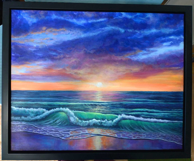16 by 20 inches acrylic paint on canvas. The second image shows it in the floating frame. I haven't stuck it down to the frame because I've been thinking over whether to add to how the waves look. I also haven't sealed it yet under clear sealer because of that. Update 10/3/2024: I like it the way it is and I've decided I'm not going to change it. Thank you Art Wanted for making this a featured image on Facebook on September 28, 2024!