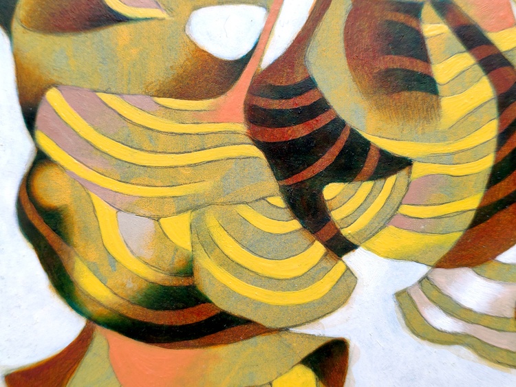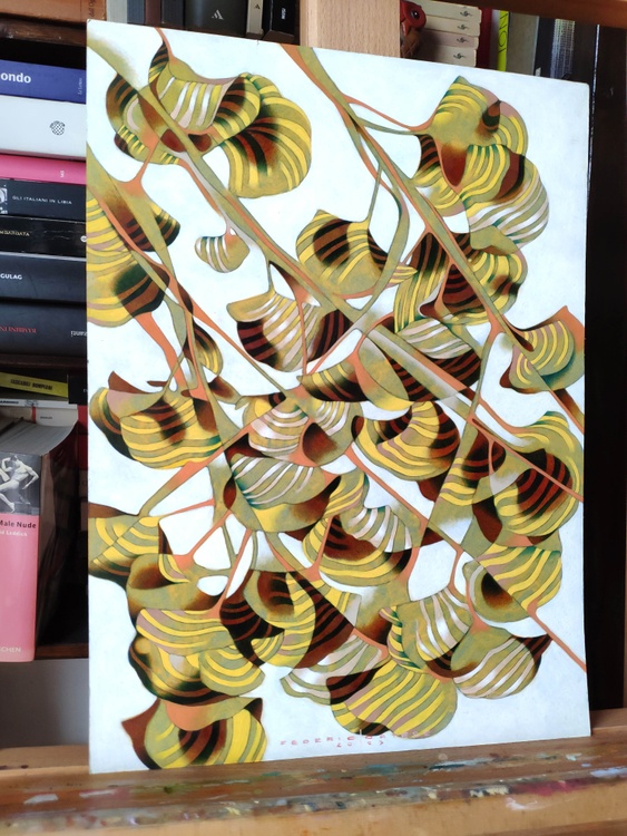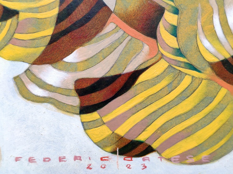 An original piece from the series “Under the shadow of a tree”, 29 x 42 cm, 2023, oil on thick paper. Let's imagine that we are lying down in a meadow on a bright spring day. At the foot of a tree the light filters through the leaves. Among the flashes that obscure the view and make us squint, the outlines of the branches, fronds and green blend and mix with the blue of the sky. The leaves crossed by the light are almost transparent, but their shadow falls upon us and protects us, instilling a sense of peace. In case of sale shipping is worldwide free.