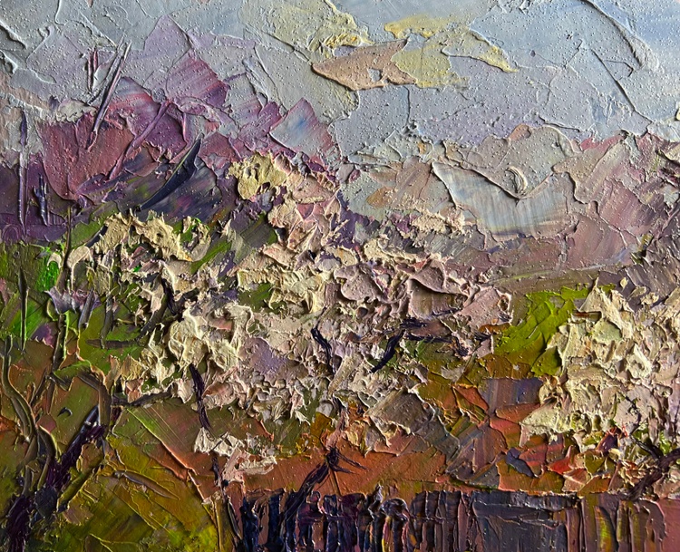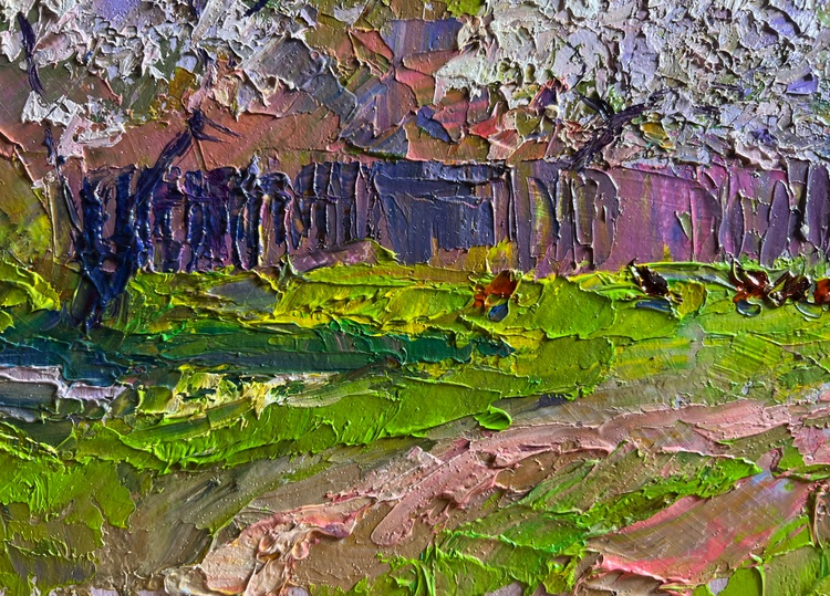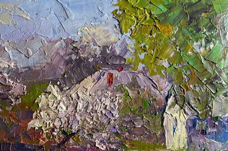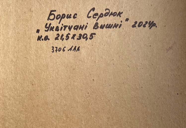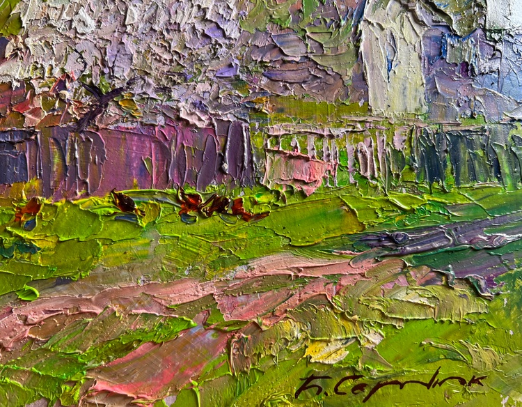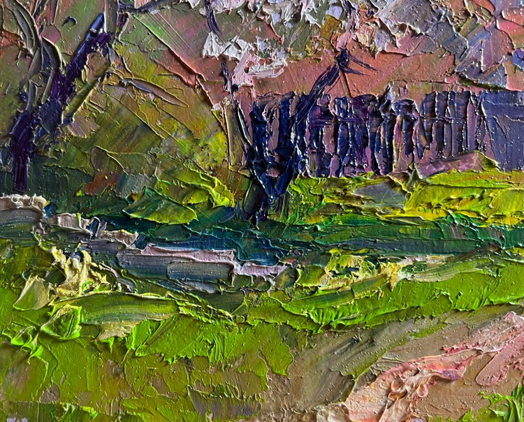 "Cherry Blossoms" is a stunning Oil painting on cardboard that captures the delicate beauty of spring in full bloom. The artist employs bold, textured brushstrokes using an impasto technique, creating a vivid, almost sculptural effect that enhances the feeling of freshness and renewal.The foreground is dominated by a soft dirt path, meandering through a lush green landscape. The grass is painted in a variety of bright greens and yellows, reflecting the vibrancy of new growth. The path leads the viewer’s eye toward a charming rural scene, where traditional houses with sloped roofs are partially hidden behind a wooden fence. The buildings, painted in earthy tones of brown, beige, and soft pink, blend harmoniously with the surroundings, evoking a sense of warmth and nostalgia.The focal point of the painting is the cherry trees in full bloom. Their branches are laden with delicate white and pale pink blossoms, which contrast beautifully against the deeper greens of the foliage. The artist has masterfully depicted the texture of the blossoms using thick, expressive strokes, making them appear almost tangible. Sunlight filters through the trees, casting dappled shadows on the grass below, adding a sense of movement and life to the scene.Above, the sky is a soft pastel blue with hints of lavender and peach, suggesting a clear, gentle spring day. Wisps of clouds add depth and airiness to the composition, enhancing the overall feeling of peace and tranquility.Through "Cherry Blossoms," the artist conveys a sense of renewal, joy, and the fleeting beauty of nature. The painting invites the viewer to pause and appreciate the simple yet profound wonders of spring—blooming trees, warm sunshine, and the quiet charm of the countryside. It is a celebration of life’s natural cycles, reminding us to embrace the present moment and find happiness in nature’s ever-changing beauty. 3706