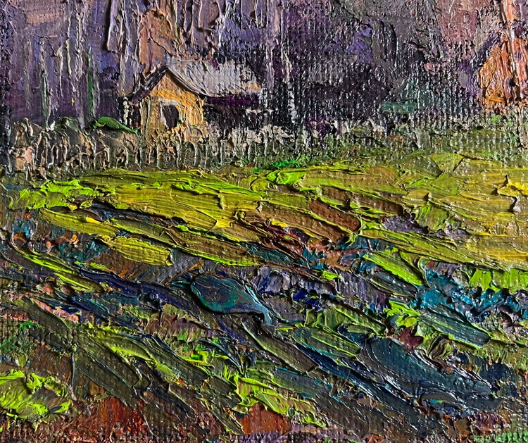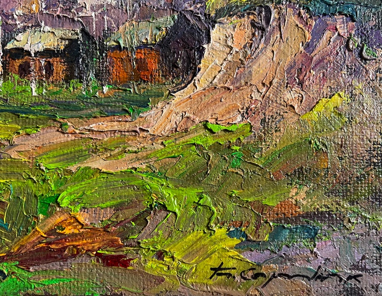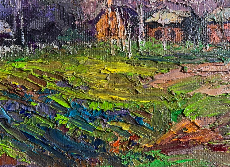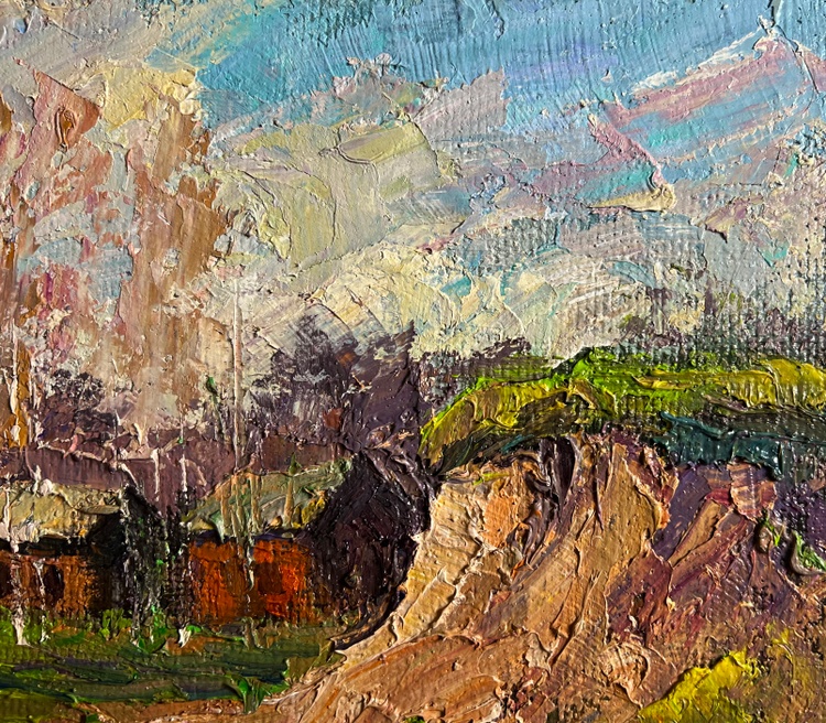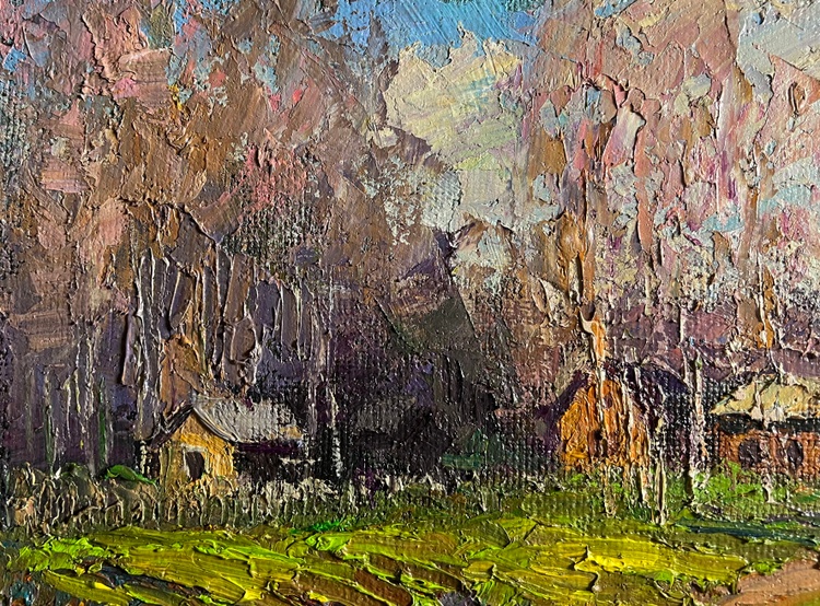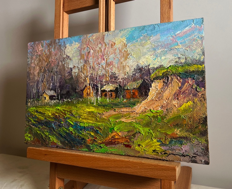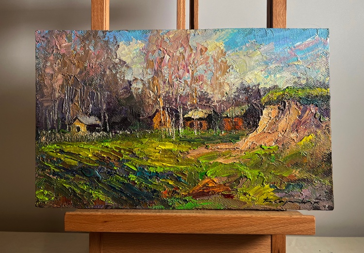 This oil painting hardboard, titled "The fragrant nature of spring", the painting is structured around a picturesque countryside scene, where wooden houses are nestled among tall trees and rolling hills. The foreground features a lush green meadow, bursting with fresh, bright hues, symbolizing the rebirth of nature. The right side of the composition is dominated by an eroded hillside, painted in warm ochres and earthy tones, contrasting with the greenery of the landscape. In the middle ground, a series of small rural houses with wooden walls and thatched or shingled roofs are tucked against a backdrop of bare-branched trees, suggesting early spring, when trees begin to bud but have not yet fully bloomed. Their warm brown and orange tones give the impression of sunlight reflecting on their surfaces. The background consists of a dense forest of tall, slender trees, painted in a mix of soft pinks, purples, and earthy browns, further reinforcing the seasonal transition. The sky, filled with bright blue and white tones, suggests a clear day with drifting clouds, enhancing the sense of openness and fresh air. The artist uses a lively and harmonious color palette, rich in warm and cool contrasts that emphasize the freshness of spring. Executed in a thick impasto style, the painting has a rich textural quality that adds depth and vibrancy to the scene. The painting conveys a feeling of warmth, renewal, and nostalgia, capturing the fragrance of fresh grass, the gentle rustling of trees, and the crisp spring air. It invites the viewer to experience a peaceful rural moment, filled with the joy of nature’s rebirth. The presence of the small houses adds a human element, suggesting a quiet village awakening to the new season. The untouched beauty of the landscape evokes a sense of serenity and timelessness, making the scene feel both vibrant and meditative. The artist's signature appears subtly in the lower right corner, blending naturally with the earthy tones of the foreground. The painting follows the impressionistic tradition, prioritizing color, light, and texture over fine details, creating a sense of atmosphere and emotional depth. 3767