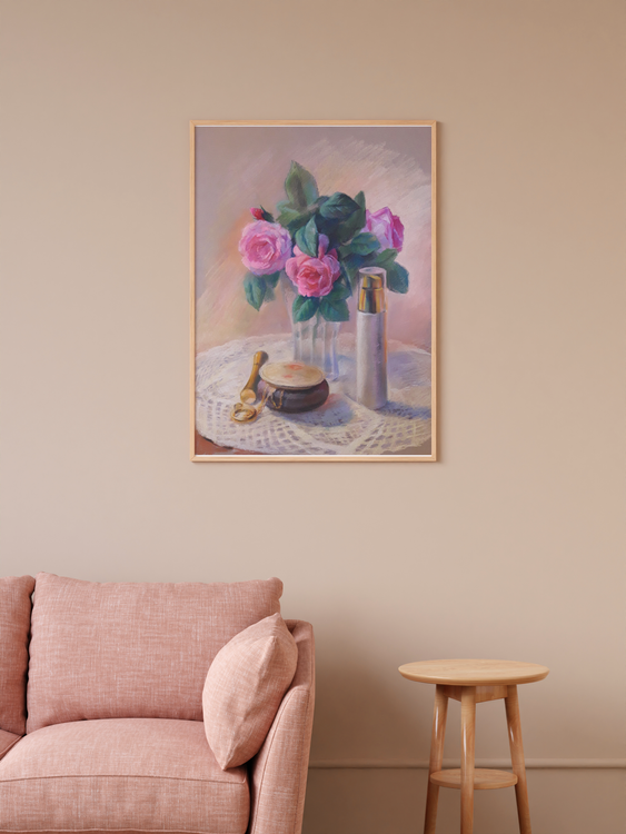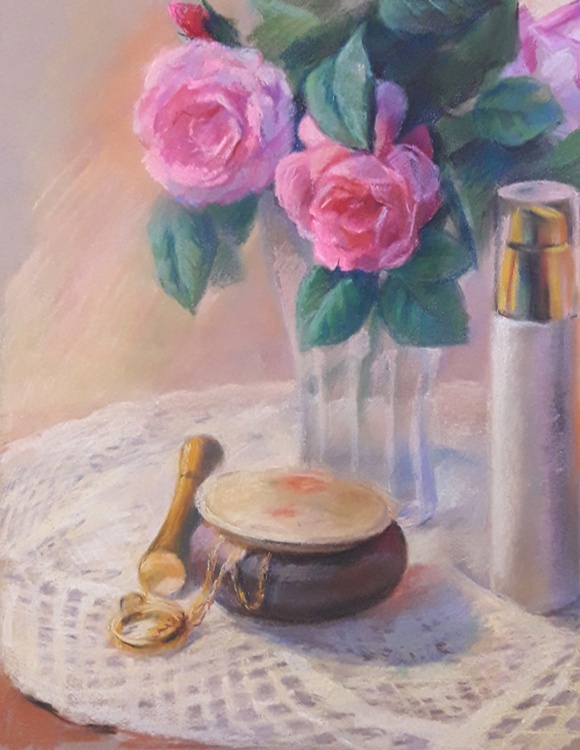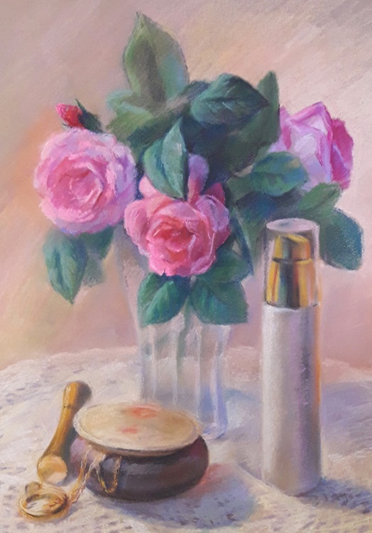 "Tea Roses" by Boris Serdyuk is a delicate still life that captures the essence of beauty, fragility, and elegance. The painting features soft pink roses placed in a glass vase, accompanied by a refined set of personal items—a golden-handled brush, a powder box, and a perfume bottle—all resting on a lace-covered table. The pastel color palette and gentle lighting emphasize the tranquil and intimate atmosphere of the scene.Through this work, the artist conveys a sense of nostalgia and charm, celebrating the fleeting beauty of nature and everyday moments. The roses symbolize grace and timeless beauty, while the objects evoke a sense of personal care and reflection. Serdyuk's painting invites viewers to appreciate life's small pleasures, where simplicity and beauty coexist harmoniously. 81