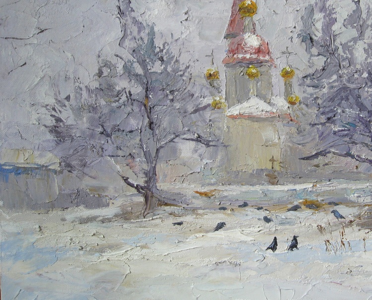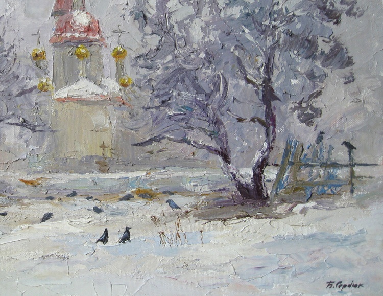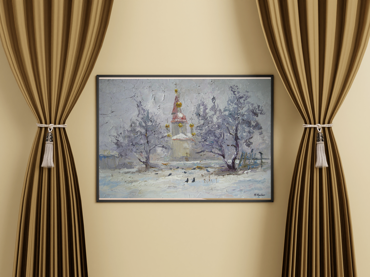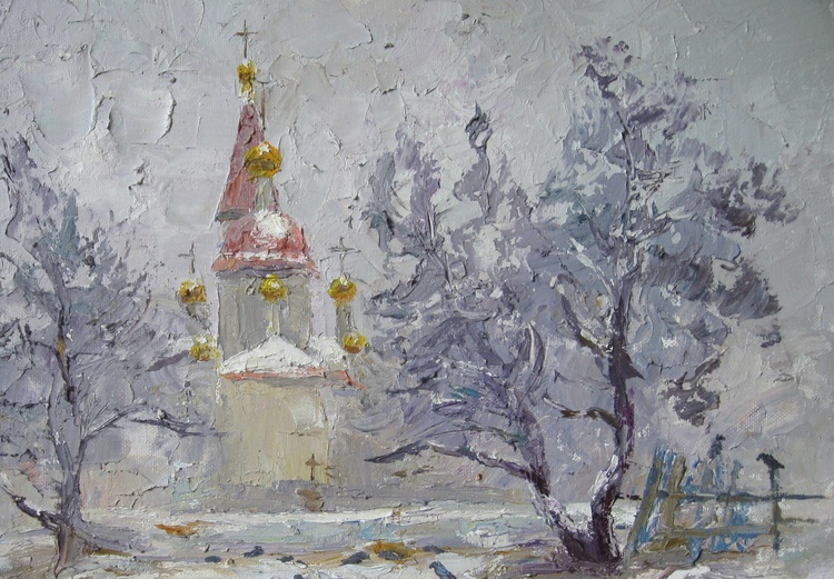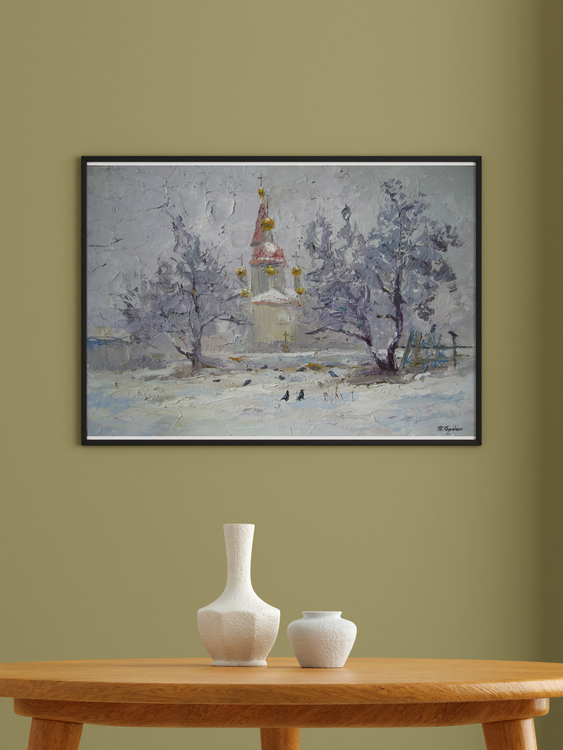 "Breathed cold", an oil painting by contemporary artist, is a stunningly realistic depiction of a winter scene. The field is blanketed in snow and the trees are covered in a layer of delicate hoarfrost. In the distance, an Orthodox church is just visible through the mist.The painting has a very calming and serene atmosphere, yet there is also a feeling of palpable tension in the air. The coldness of the winter landscape is palpable, and the viewer can almost feel the biting wind on their skin. This is a truly remarkable work of art that will leave a lasting impression on all who see it. 95