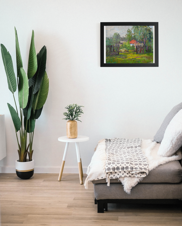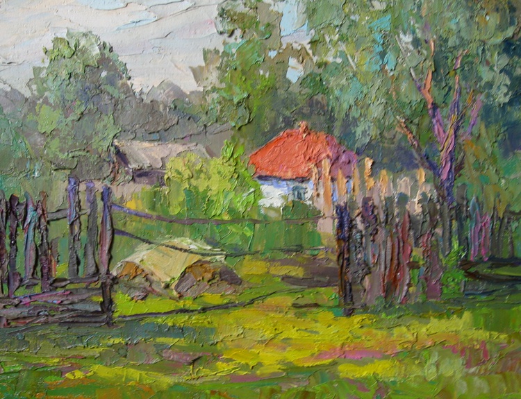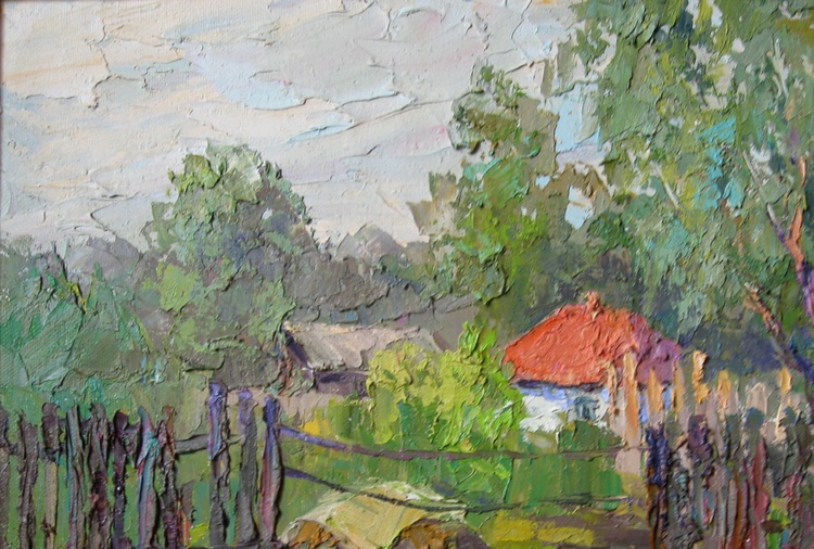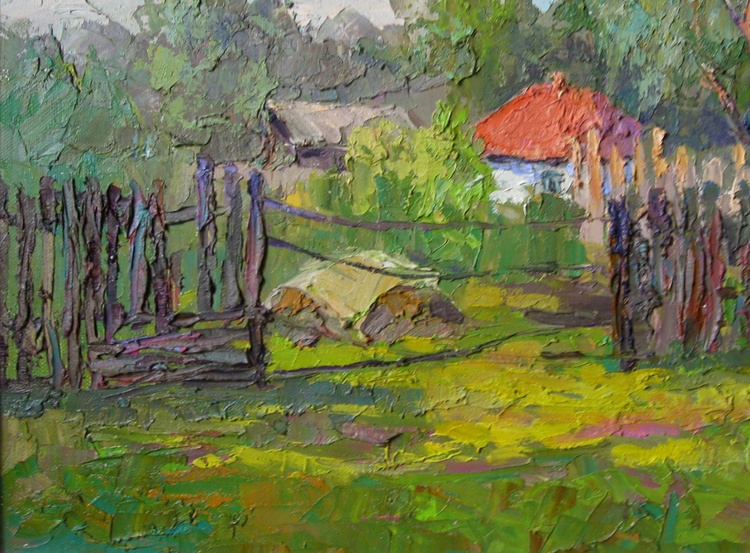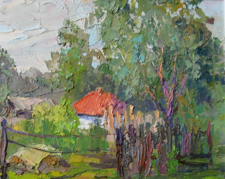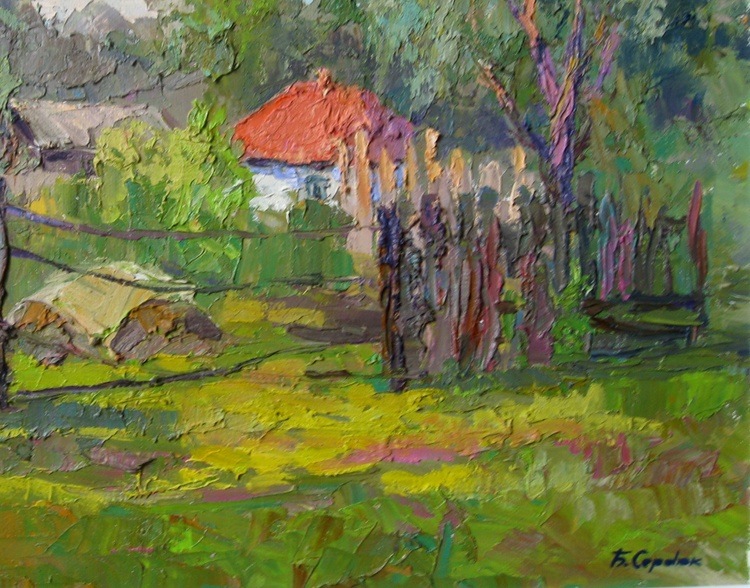 "White House" by Boris Serdyuk depicts a serene rural scene, focusing on the simplicity of life in the Ukrainian countryside. The bright red roof of the small white house stands out among the lush greenery, inviting the viewer into a peaceful, idyllic world. The rough texture of the brushstrokes conveys the rustic charm of nature, blending shades of green, purple, and earthy tones.Through this work, the artist captures the beauty of rural tranquility, evoking a sense of nostalgia and connection to nature. The open gate in the foreground symbolizes the warmth and openness of such places, where simplicity and harmony with nature prevail. It reflects Serdyuk’s appreciation for everyday moments and the peaceful rhythm of life in the village. 96