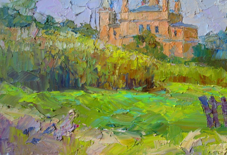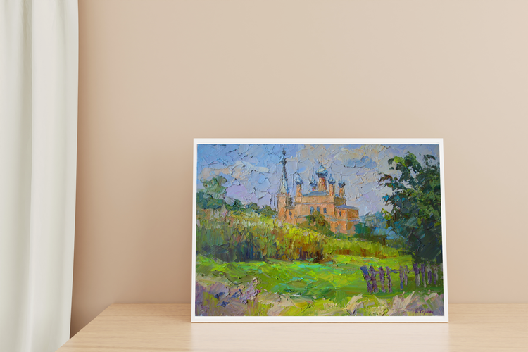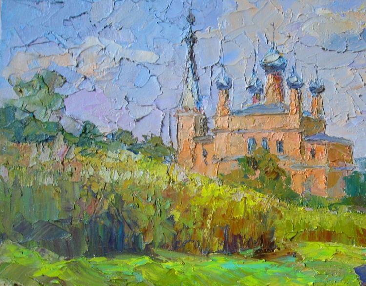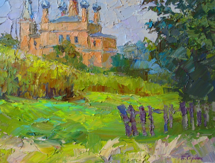 "Temple of the Epiphany" by Boris Serdyuk captures the serene beauty of a historical church nestled within lush greenery. The artist uses expressive, textured strokes to convey the warmth of the surrounding landscape, contrasting the vibrant greens of the foliage with the soft, pastel tones of the temple walls. The domes of the church rise gracefully toward the sky, adding a sense of spiritual ascension to the scene.Through this work, Serdyuk expresses a reverence for faith, heritage, and harmony with nature. The painting reflects a moment of peace and contemplation, inviting the viewer to experience the calming presence of the temple, symbolizing a connection between the earthly and the divine. 103