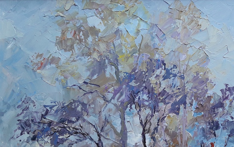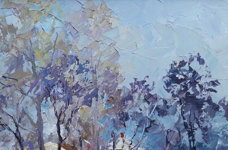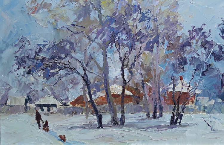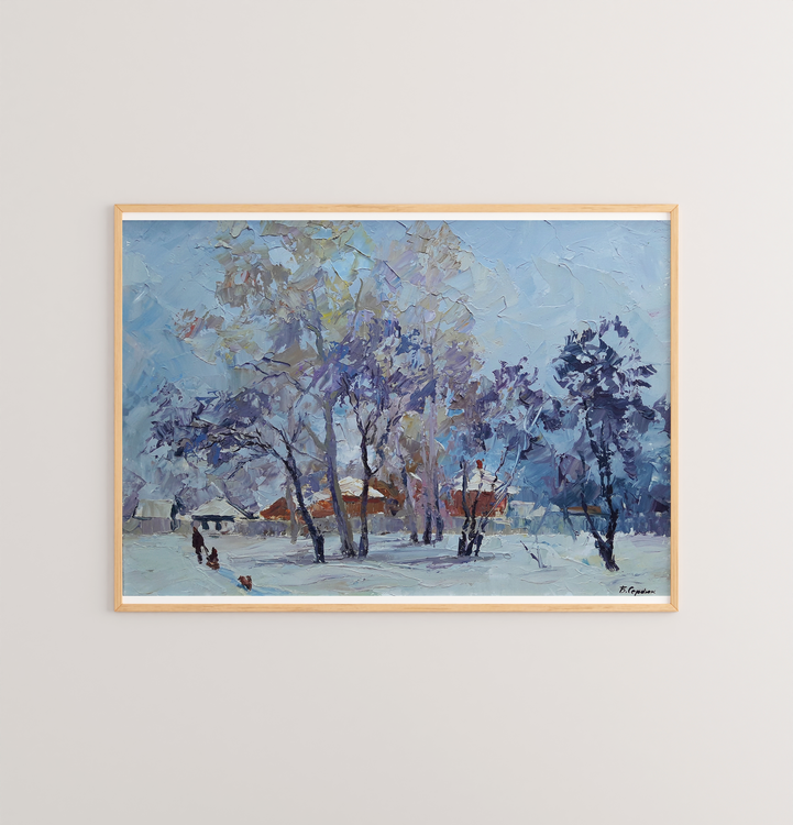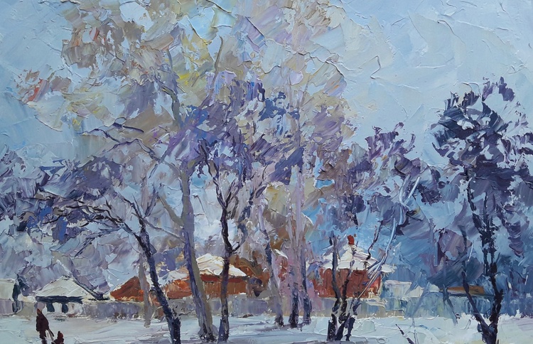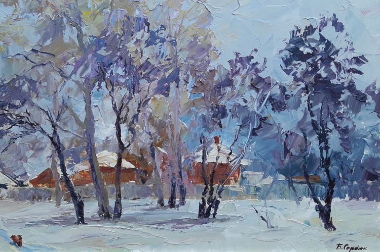 "Winter Day" by Boris Serdyuk portrays a peaceful scene of a winter village bathed in soft daylight. The trees, barren and covered in frost, frame cozy homes with snow-covered roofs. Through textured brushstrokes, Serdyuk captures the stillness of winter, conveying a sense of calmness and serenity.The muted palette of whites, blues, and purples, combined with the delicate sunlight reflecting off the snow, evokes a chilly yet tranquil atmosphere. Figures walking with a small dog hint at the quiet routines of village life in winter. The artist likely intended to express the harmony between nature and human existence, showing how the harshness of winter becomes a gentle backdrop for everyday moments, inviting viewers to appreciate the subtle beauty within a simple winter day. 196