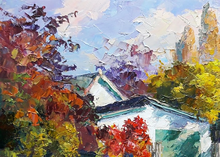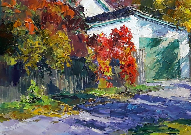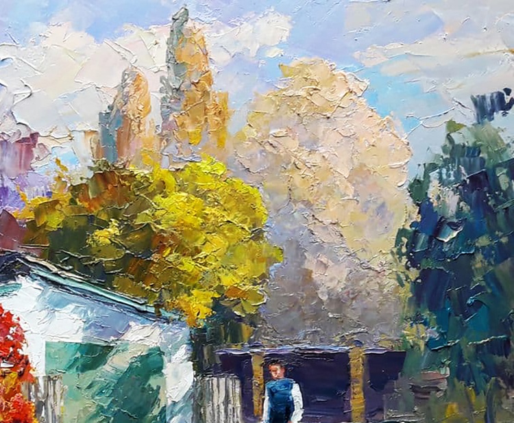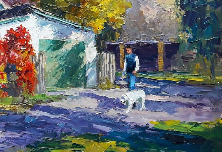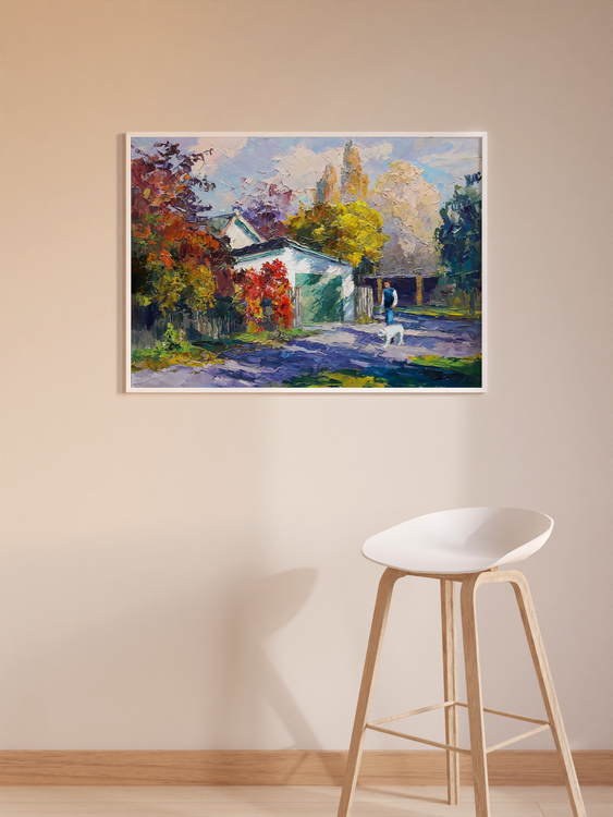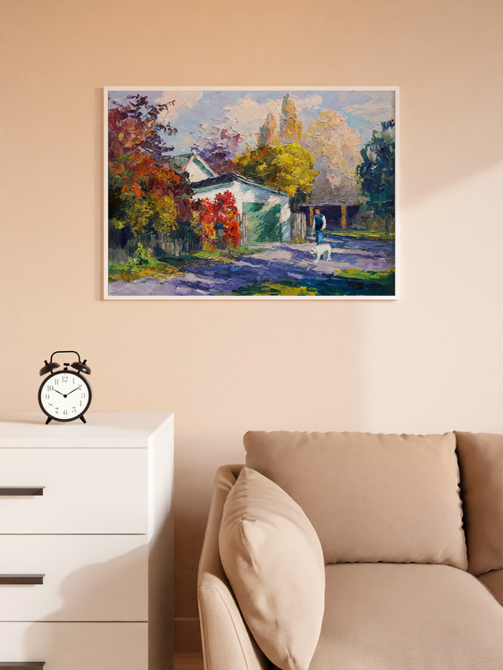 Looking for a stunning oil painting that captures the beauty of autumn? Look no further than "Autumn Morning"! This enchanting painting features a village street shrouded in autumn leaves, with golden trees standing tall against a bright blue sky. A lone figure can be seen walking their dog down the street, basking in the glorious autumn sunshine. This painting is sure to bring a touch of autumnal magic to any room it's placed in! Whether you're looking to add some seasonal decoration to your home or simply want to enjoy the beauty of nature all year round, "Autumn Morning" is the perfect choice. Order today and let this charming painting brighten up your day! 719