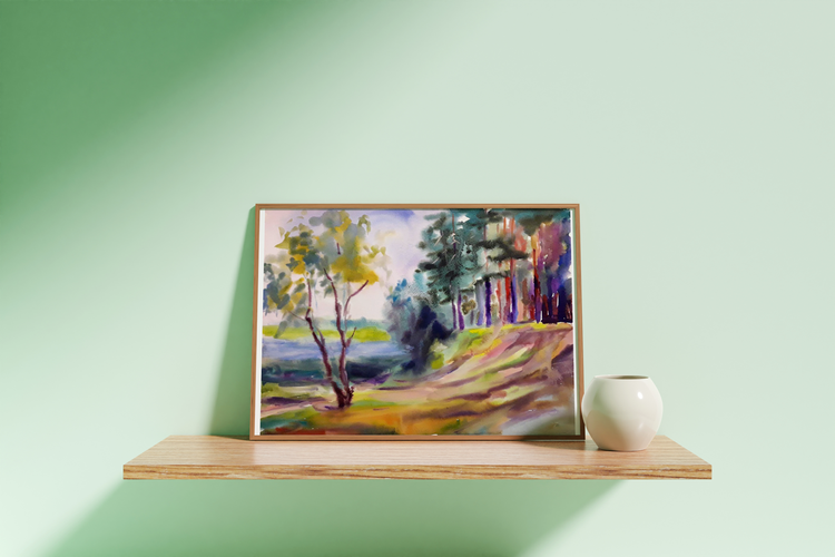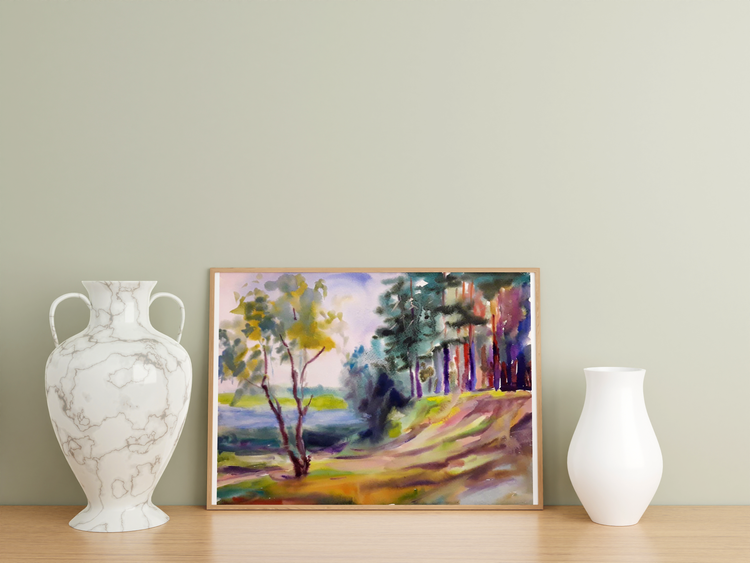 In the watercolor painting "In the Sumy Region" by renowned Ukrainian artist Serdyuk Boris, the viewer is gently drawn into a peaceful forest landscape. With fluid, luminous brushstrokes, the artist captures a serene moment where a narrow path curves between sun-dappled pines and a tranquil riverbank. The composition blends warm earthy tones with fresh greens and soft purples, evoking the gentle beauty of northern Ukrainian nature. This work expresses a sense of quiet intimacy with the land. Boris conveys the stillness and harmony of a rural place untouched by haste—where every tree leans naturally into the light, and the soft hills whisper of home. Through this calm and impressionistic rendering, the artist celebrates the deep connection between the Ukrainian people and their native landscape. 732