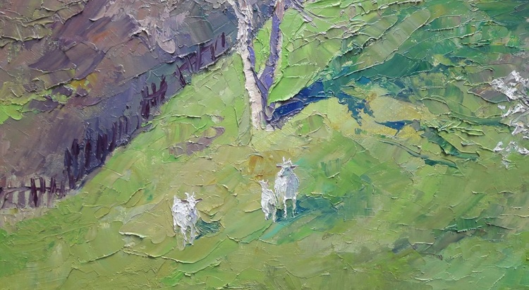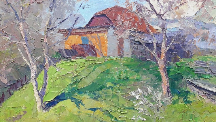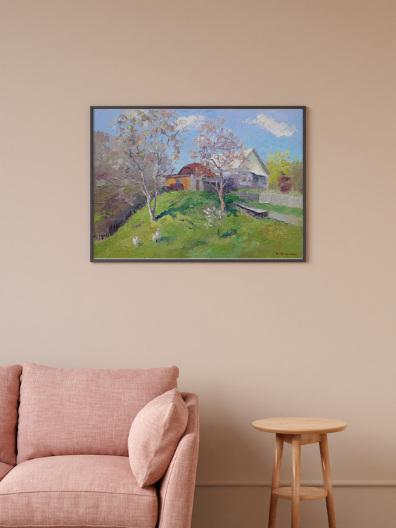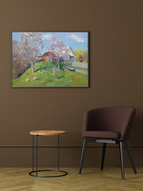 Are you looking for a stunning piece of art to add to your collection? Or are you simply searching for the perfect gift for that hard-to-please person in your life? Whatever the reason, you're sure to find exactly what you're looking for with our oil painting "April day." This beautiful painting features a village house on a hill, surrounded by lush green grass and flowering trees. Goats walk nearby, enjoying the spring weather. The colors are vibrant and the overall effect is simply stunning. This is more than just a pretty picture, however; it's also a work of art that is sure to be treasured for many years to come. Hand-painted by skilled artisans, this oil painting is of the highest quality. It's an investment that you'll be proud to make. So don't wait any longer; add this gorgeous painting to your cart today! 743