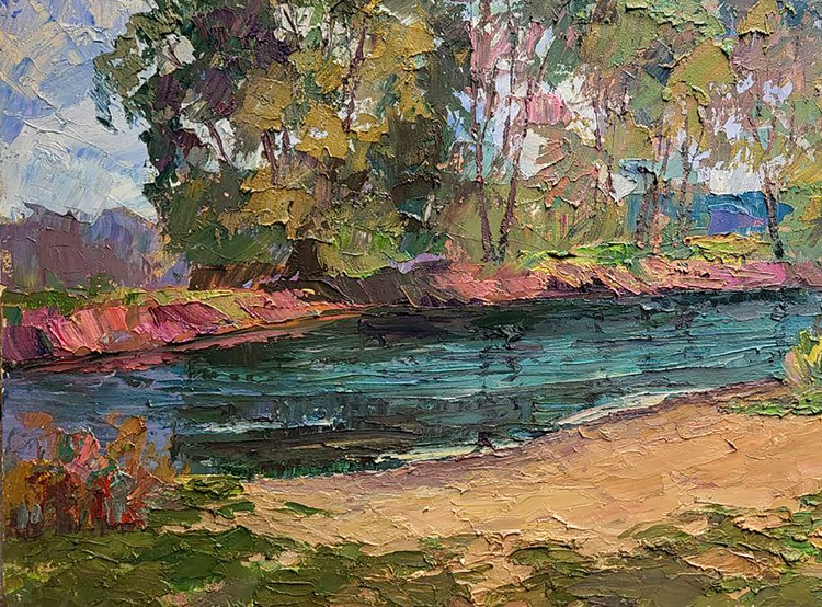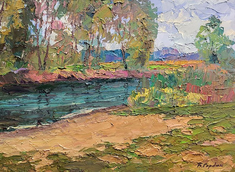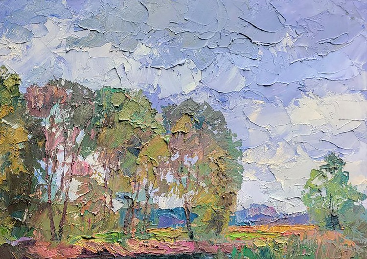 "Bad Weather" is an oil painting that captures the essence of a summer landscape amidst an impending storm. The scene unveils a picturesque riverbank, vibrant with lush greenery, serving as the focal point of the composition. In the foreground, a meandering river flows gently, its shimmering surface reflecting fragments of light despite the impending grayness overhead. The riverbank, adorned in various shades of green, forms a natural frame for the serene waterway. Tall grasses sway gracefully along the edges, their delicate blades reaching towards the water's edge. Here and there, clusters of wildflowers add splashes of vibrant color, seemingly unaware of the weather's imminent change. Beyond the river, a dense forest of trees rises majestically towards the heavens, forming a verdant backdrop. These trees, adorned with vibrant foliage, stand tall and strong, creating a harmonious transition from the foreground to the sky. Their lush leaves dance in the warm summer breeze, hinting at the vitality of the season. However, the sky above casts a somber mood over the idyllic landscape. Thick gray clouds dominate the heavens, obscuring the sunlight that once bathed the scenery in warmth. The gloomy atmosphere suggests the impending arrival of rain, as if nature itself is preparing for an outpouring of emotions. The ethereal lighting permeates through the overcast sky, lending a sense of drama and intensity to the scene. The overall composition of "Bad Weather" invokes a captivating contrast between the tranquility of the vibrant riverbank and the brooding intensity of the impending storm. It serves as a metaphorical representation of life's unpredictable nature, where beauty and serenity coexist alongside uncertainty and turbulence. The painting invites viewers to reflect on the transient nature of moments of calm and appreciate the delicate balance between harmony and disruption in the natural world. 893