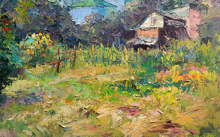 "Renovation of the Temple" is a captivating oil painting that beautifully captures the essence of a summer landscape. The scene unfolds with meticulous brushstrokes, inviting the viewer into a serene garden brimming with life. The artist skillfully portrays a harmonious balance between the foreground and the background, offering a captivating visual narrative. In the foreground, a meticulously manicured garden comes to life with an explosion of vibrant colors. Lush, emerald-green grass stretches out before the viewer's eyes, punctuated by meticulously placed flowers that burst forth in an array of hues. Delicate blossoms adorn the neatly trimmed hedges, creating a tapestry of pinks, purples, and whites that dance in the gentle summer breeze. As one's gaze moves toward the background, a cluster of majestic trees rises, their sturdy trunks reaching toward the heavens. The dense foliage creates a cool, tranquil atmosphere, providing respite from the warm sunrays that penetrate through the leafy canopy. Sunlight filters through the branches, casting dappled shadows on the ground below, offering a play of light and shade that enhances the painting's depth and texture. Nestled within this verdant embrace of nature, the focal point of the painting emerges—a magnificent temple, under renovation. The artist expertly depicts the grandeur of the temple's architecture, with its imposing dome rising towards the sky. Intricate details adorn the temple, showcasing the craftsmanship of the bygone era. Scaffolding and ladders reveal the ongoing repairs, hinting at the passage of time and the dedication to preserving this sacred space. The sky above the scene is enveloped in a canopy of gray clouds, casting a soft, diffused light over the entire landscape. This muted palette of the sky contrasts with the vibrant colors of the garden, lending an air of tranquility and introspection to the painting. The artist's choice to portray a gray sky also serves as a metaphor, symbolizing the passage of time and the cyclical nature of life, where renewal and restoration coexist with the ephemerality of existence. "Renovation of the Temple" is a masterpiece that transports the viewer to a timeless moment in a summer landscape. Through its meticulous attention to detail and masterful composition, the painting captures the beauty of nature, the significance of human endeavor, and the enduring spirit of preservation. 895