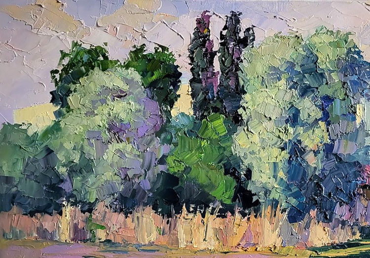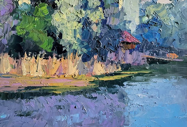 In the oil painting "By the River," the artist masterfully captures the serene beauty of a summer landscape. The viewer is transported to a tranquil scene where nature's elements harmoniously converge, evoking a sense of both tranquility and contemplation. A meandering river takes center stage in the foreground, its surface adorned with gentle ripples that catch the muted light of the overcast sky. The river's crystalline waters mirror the surrounding scenery, doubling the impact of the picturesque view. Its banks are dotted with delicate wildflowers, their vibrant colors standing out against the subdued palette of the landscape. The water's edge is kissed by the soft touch of tiny waves, imbuing the scene with a subtle, natural movement. As the river wends its way toward the distance, the landscape transitions into a dense forest that forms the midground of the painting. The forest is a lush and verdant expanse, dominated by a variety of trees – tall and proud, their leaves rustling gently in the summer breeze. The canopy casts dappled shadows on the forest floor, creating a play of light and shadow that adds depth and dimension to the composition. Shafts of subdued sunlight pierce through the foliage, lending an almost ethereal quality to the scene. Above the forest, the sky stretches like a canvas of pale gray. The overcast sky, although devoid of a brilliant blue, brings a unique sense of calm to the landscape. The gray expanse is subtly textured, hinting at the ever-present potential for rain. Despite the lack of a bright sun, the subdued lighting enhances the intricate details of the natural surroundings. It is summer in the painting, and the artist expertly captures the essence of the season. The forest is at its peak of lushness, a testament to the vitality of life during this time of growth. The wildflowers at the river's edge are in full bloom, celebrating the warm embrace of the season. Even though the sky is gray, the landscape exudes a quiet warmth that is synonymous with the lazy days of summer. "By the River" is not merely a depiction of nature, but a carefully orchestrated symphony of elements that together create a harmonious and contemplative visual experience. The painting invites the viewer to step into this idyllic world, to feel the soft breeze, hear the gentle rustling of leaves, and be transported to a place where time stands still, and the beauty of the natural world reigns supreme. 921