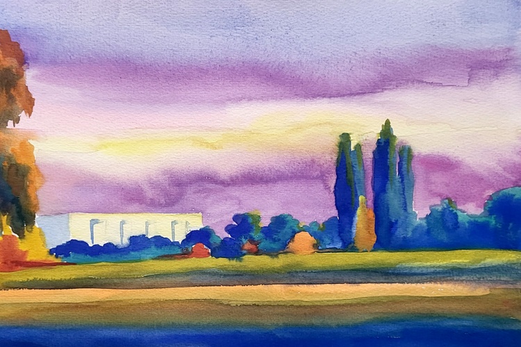 The watercolor painting titled "Evening" captures a tranquil and dramatic sunset scene. The composition is a harmony of vivid and bold watercolor washes that blend together to depict the evocative transition from day to night. Dominating the canvas is a towering tree to the left, painted with dark, rich blues and blacks, with hints of warm oranges peeking through its foliage, suggesting the tree is still touched by the sun's fading rays. The tree stands as a solitary sentinel against the backdrop of the dusk sky. The sky itself is a masterpiece of gradient hues, with bands of purple and violet that suggest the onset of night, while streaks of soft peach and yellow indicate the last light of the setting sun. This interplay of colors suggests a sky in flux, echoing the fleeting nature of twilight. Below, the land is portrayed in blocks of color, with the foreground featuring deep, cool blues and greens that represent shadowy fields or stretches of grass, giving way to warmth as the land rises to meet the horizon. The middle ground is illuminated by the sun's lingering light, with washes of yellow and orange that give the impression of a landscape still basking in the day's last warmth. In the distance, a stark white building with dark windows breaks the line between earth and sky, a sign of human presence that is small and almost insignificant against the grandeur of the natural scene. To the right, vertical strokes of green suggest a group of trees or a copse, standing in contrast to the open fields. "Evening" is a watercolor landscape that speaks of the quiet moments at day's end. It is a testament to the beauty found in daily cycles, a reminder of the calm and reflection that twilight brings. The painting invites the viewer to pause and appreciate the peaceful transition from daylight to the soft glow of evening. 936
