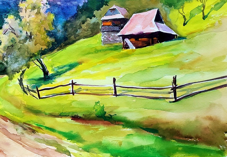 This watercolor painting, titled "Carpathian Austrian Houses," vividly captures the pastoral charm and serene beauty of a rural landscape, likely inspired by the Carpathian region with its rich history and culture. The painting is characterized by its vibrant greens and blues, which fill the composition with life and energy. A dirt road, rendered in shades of beige and light brown, sweeps through the foreground, curving around the hillside and leading the viewer's eye into the scene. Its winding path suggests a journey or exploration into the heart of this bucolic setting. On the rolling hillside, a rustic wooden fence demarcates the boundaries of the lush meadows, and its simple construction adds to the quaint, rural feel of the landscape. The grass is painted with bold and dynamic strokes of yellow-green, suggesting the bright light of the sun casting its warmth upon the land. Nestled atop the hill are traditional Austrian-style houses, characterized by steep roofs and solid construction, designed to withstand the mountain environment. The roofs are a ruddy brown, complementing the natural tones of the landscape, while the walls of the houses are touched with light and shadow, giving them dimension and solidity. The backdrop is a rich tapestry of forest and mountainside, with the foliage showing various shades of green, blue, and purple, creating a sense of depth and the lush density of the Carpathian woodlands. The artist has skillfully layered these colors to give an impression of the wild, untamed nature that lies just beyond the settlement. The sky above is a soft, diffuse blue with hints of white, suggesting a clear day with a few clouds gently scattered across the sky, adding a sense of tranquility and space to the composition. Overall, "Carpathian Austrian Houses" is a celebration of nature and rural life, showcasing the timeless beauty of the Carpathians with a vibrant palette and a sense of peacefulness that is often found in such secluded landscapes. 949