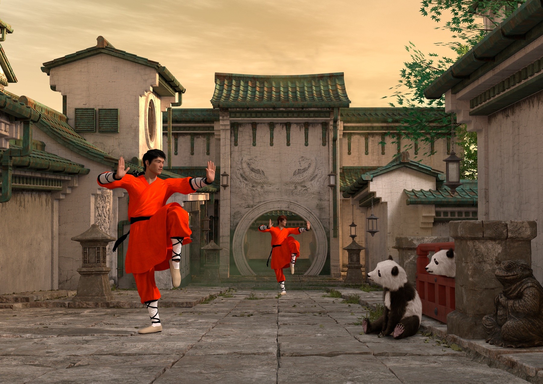 Two men practice martial arts techniques in a serene courtyard. Nearby, two pandas curiously observe the scene.