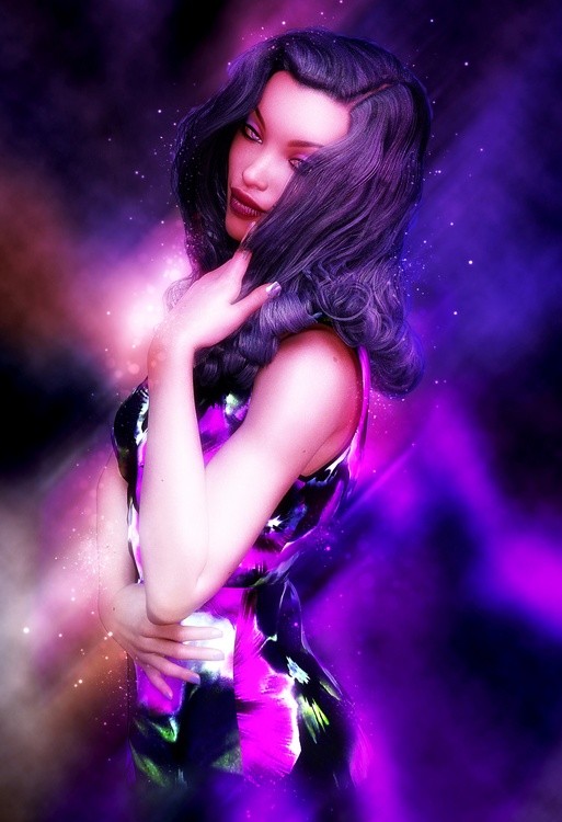 This is a digitally created, hyper-realistic portrait of a young woman with a dreamy, ethereal quality. The subject is a dark-skinned woman of African Decent, with long, wavy, dark hair that cascades past her shoulders. She has a slender build and is wearing a sleeveless, form-fitting dress with a vibrant, abstract floral pattern in shades of pink, purple, and black. Her right hand is delicately touching her neck, while her left arm is crossed over her torso, creating a graceful, almost melancholic pose. Her facial features are soft and elegant, with high cheekbones, full lips painted in a subtle pink shade, and slightly arched eyebrows. She has a subtle, enigmatic smile and her eyes are a striking shade of purple, which matches the overall color scheme of the image. The background is a blend of dark purples and pinks with soft, glowing light effects that give the image a magical, otherworldly atmosphere. Tiny, sparkling particles float around her, enhancing the ethereal feel. The lighting is soft and diffused, highlighting her figure and the vivid colors of her dress, while the background remains slightly blurred, drawing focus to the subject. The overall style is reminiscent of fantasy or sci-fi digital art.