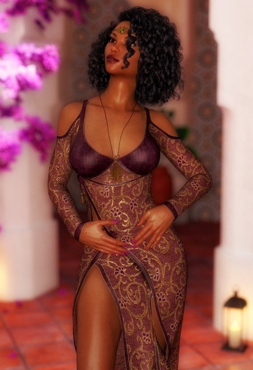 This is a highly detailed, digital CGI image of a dark-skinned woman with a curvaceous figure, standing in a warmly lit, Mediterranean-style courtyard. She has a medium to dark brown skin tone and short, tight, curly black hair. Her facial features are accentuated with dark, bold lipstick and she wears a small green gemstone on her forehead. Her eyes are closed, and she has a serene expression on her face. She is dressed in an elaborate, form-fitting, long-sleeved dress with intricate, gold and burgundy lace patterns. The dress has a deep V-neckline, revealing a burgundy, semi-sheer bra that highlights her ample breasts. The dress also features high slits on both sides, showing her toned legs. She is wearing a long, thin gold necklace that hangs down to her midriff. The background includes white, arched doorways and a tiled floor in earthy tones. To the left, there are vibrant purple bougainvillea flowers in full bloom, and to the right, there is a softly glowing lantern on the floor. The overall atmosphere is warm and exotic, with a focus on the woman's elegant and alluring presence.