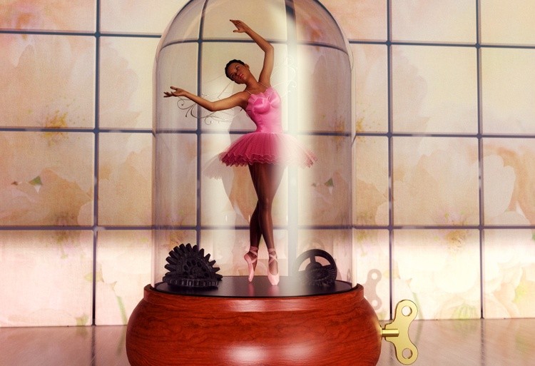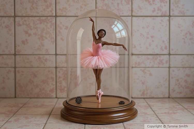 This photograph depicts a delicate, life-sized ballerina figure encased in a transparent dome with a polished wooden base. The ballerina, with a dark brown skin tone, is posed gracefully in a ballet position, with one arm extended upward and the other out to the side, while her right leg is bent at the knee and her left leg is extended behind her in a classic arabesque. She wears a vibrant pink tutu with ruffled layers and pink pointe shoes, adding a touch of color and elegance to the scene. The dome, which has a slight sheen, is supported by a circular wooden base with ornate gold detailing on the sides. Two black, gear-like objects are positioned at the base of the dome, adding an element of contrast and intrigue. The background consists of a wall with large, square tiles in a soft, pastel palette of beige and pink, featuring subtle floral patterns. The lighting is soft and natural, highlighting the ballerina's form and the textures of the dome and base. The overall composition creates a sense of both fragility and strength, blending the ethereal quality of the ballerina with the solidity of the dome and base.