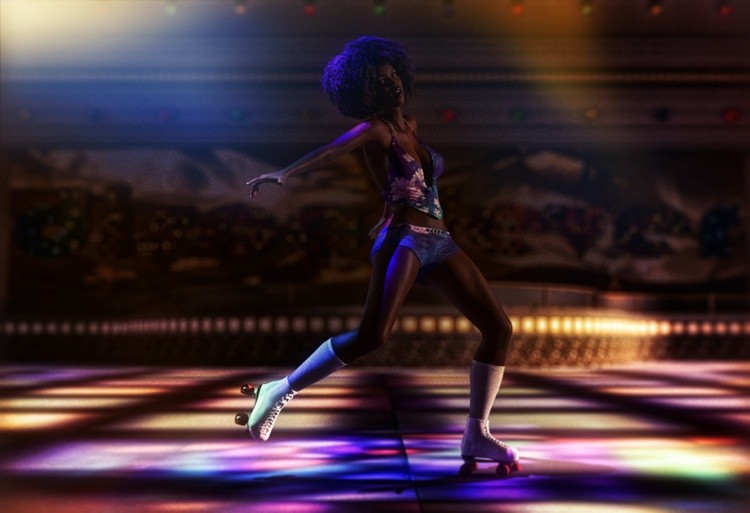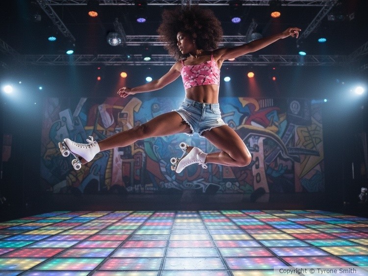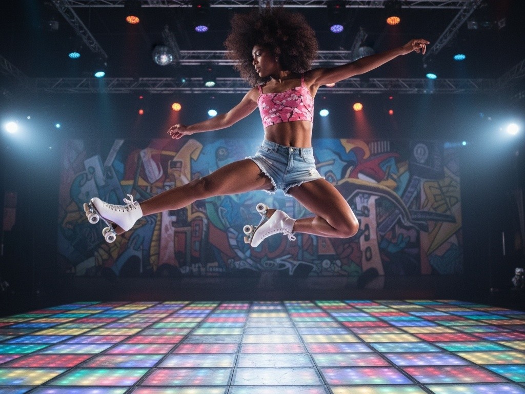 Realistic image depicting a dynamic scene of an African American female dancer performing on a brightly lit dance floor. The dancer is in mid-jump, with her right leg extended forward and her left leg bent backward, creating a sense of motion and energy. She has a curly, voluminous afro hairstyle and is wearing a pink, floral-patterned crop top that reveals her midriff, along with very short, light blue denim shorts. Her outfit is accessorized with white, high-heeled roller skates that have a shiny, reflective surface. The background is a dimly lit, large dance hall with colorful, multicolored spotlights casting vibrant patterns on the floor. The floor itself is made up of square tiles, each illuminated by different colored lights, creating a vivid, kaleidoscopic effect. Above, the ceiling is adorned with additional colorful lights, adding to the festive atmosphere. In the background, there is a blurred mural or graffiti-like artwork, adding an urban, lively feel to the scene. The overall style of the image is highly dynamic and energetic, capturing the essence of a lively dance performance in a vibrant, colorful setting.