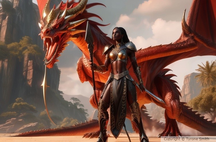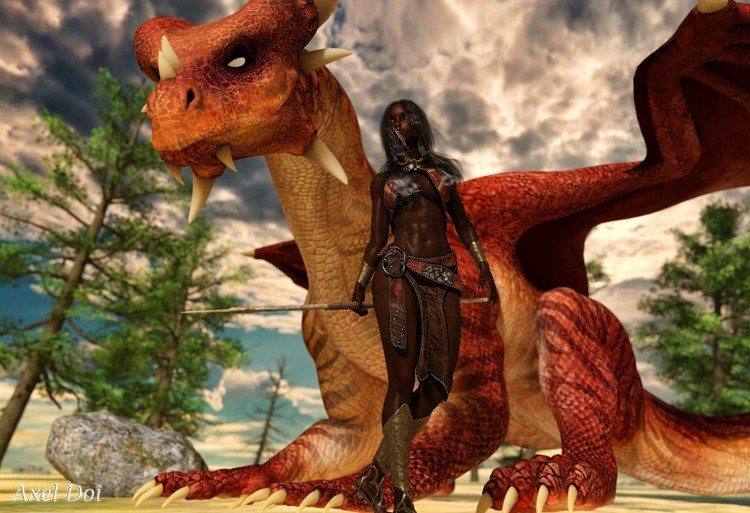 This is a CGI-rendered image featuring a dark-skinned, muscular female warrior of African decent standing beside a large, red-scaled dragon. The warrior has long, black hair and is dressed in dark, leather armor with intricate silver and gold patterns. She is holding a long spear in her right hand. The dragon has a robust, orange-red body with darker red stripes, large white horns, and a long neck. Its wings are partially spread, showing the leathery texture. The background depicts a natural, outdoor setting with a cloudy sky, green trees, and a rocky landscape. The colors are vibrant, with the red of the dragon contrasting against the greenery and the cloudy sky. The image is detailed, with textures on both the dragon's scales and the warrior's armor clearly visible. The overall style is realistic with a fantasy theme, emphasizing the bond between the warrior and his dragon companion.