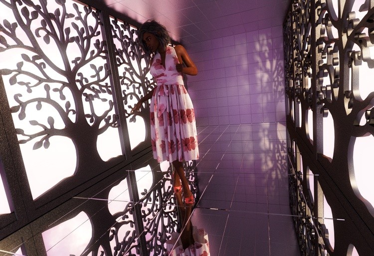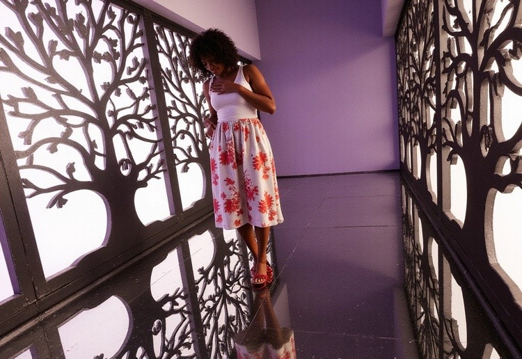 Photograph of a dark-skinned woman with curly hair standing in a narrow, reflective hallway. She wears a sleeveless, white dress with red floral patterns and red sandals. The hallway walls feature intricate black metal tree-like cutouts, casting shadowy tree patterns on the glossy, tiled floor. Soft purple lighting adds a gentle glow, enhancing the reflective surfaces and shadows. The woman stands slightly to the left, looking downward with her hands near her chest. The image has a modern, artistic feel, with a focus on light, shadow, and reflection.