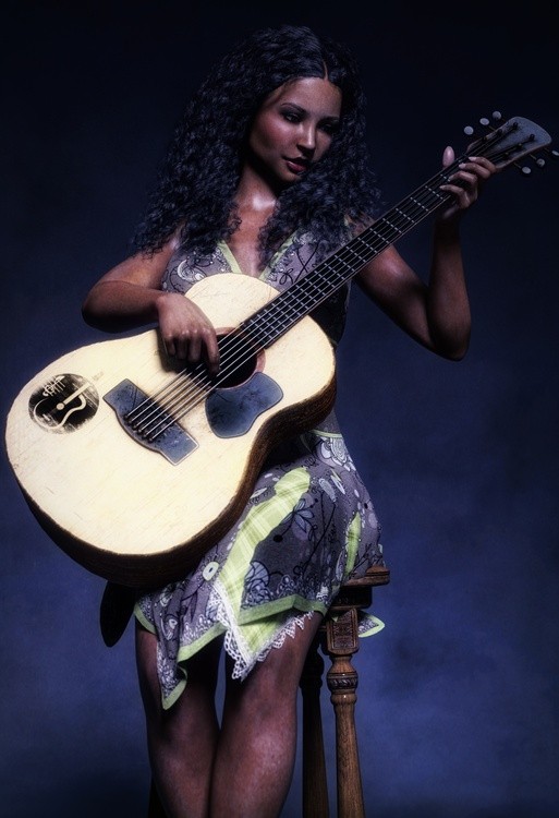 This is a highly detailed, realistic photograph of a woman playing an acoustic guitar. She has dark brown skin and long, curly black hair that cascades down her shoulders. She is wearing a sleeveless, semi-sheer dress with a floral pattern in shades of gray and green, which slightly reveals her shoulders and upper chest. The dress has a delicate, lace-like texture and a slightly asymmetrical hem that ends above her knees. She is seated on a wooden stool with a simple, rustic design. The guitar is a classic acoustic model with a light wooden body and dark fretboard. The woman holds the guitar with her left hand on the fretboard and her right hand near the sound hole, as if playing a chord. The background is a dark, gradient blue, which contrasts with her skin tone and the lighter colors of her dress and guitar. The lighting is soft but focused, highlighting the textures of her hair, the guitar, and the fabric of her dress. The overall mood of the photograph is intimate and artistic, capturing a moment of musical expression.