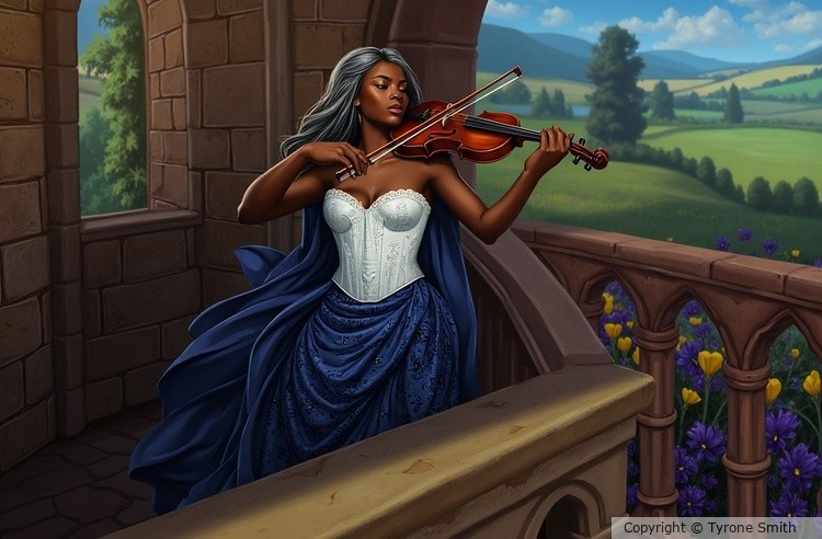 This is a digital artwork depicting a dark-skinned woman playing a violin on a stone balcony. She has long, straight, silver-gray hair and is dressed in an elegant, strapless white corset with intricate lace detailing, paired with a voluminous, blue, patterned skirt. Draped over her shoulders is a flowing, blue cape. Her physique is slender and toned, and she is standing with a focused expression, her eyes closed as she plays. The violin is a rich, warm brown color with a glossy finish, and she holds it under her chin with her left hand while her right hand delicately plucks the strings. The balcony is made of aged, textured stone with Gothic-style arches, and it overlooks a vibrant, colorful landscape in the background. The landscape features a lush, green meadow with a variety of wildflowers in shades of yellow, purple, and blue, under a blue sky with soft, white clouds. The sunlight filters through the scene, casting a warm, golden glow that highlights the woman and the balcony. The overall style of the artwork is realistic with a touch of fantasy, emphasizing the serene and magical atmosphere.