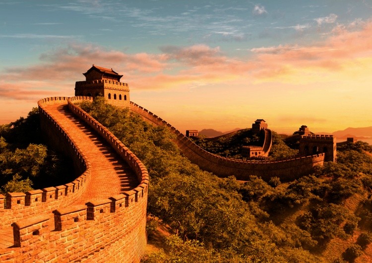 The Great Wall of China stretches across a lush, hilly landscape under a vibrant sunset. The structure's ancient stones are bathed in warm golden light.