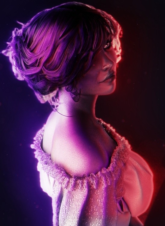 This is a highly stylized, digitally manipulated photograph of a young woman with dark skin skin tone of African Decent, viewed in a side profile against a dark, starry background. Her hair is short, wavy, and dyed in shades of purple and pink, with soft, glowing highlights. She is wearing an off-the-shoulder, white lace top with puffed sleeves that have a delicate, textured appearance. The lighting is dramatic, with a combination of purple and pink hues that cast a soft glow on her face and hair, creating a surreal, almost ethereal effect. Her expression is calm and contemplative, with her lips slightly parted. The background is dark, with small, glowing particles that resemble stars or sparks, adding to the magical atmosphere of the image. The overall style is modern and fantasy-like, with a strong emphasis on color and light to create a dreamy, otherworldly effect. The textures of the lace and the glow on her skin are particularly detailed, adding depth and realism to the photograph. Pink and purple shade of light hits the model, one shade on each side.