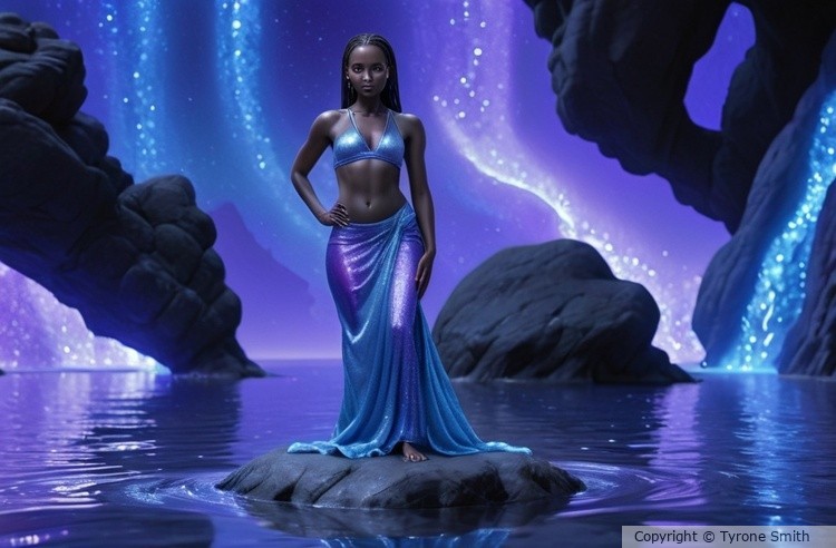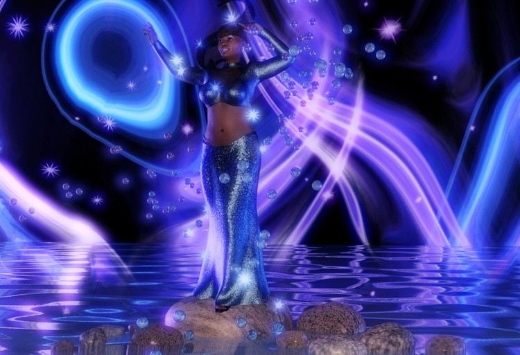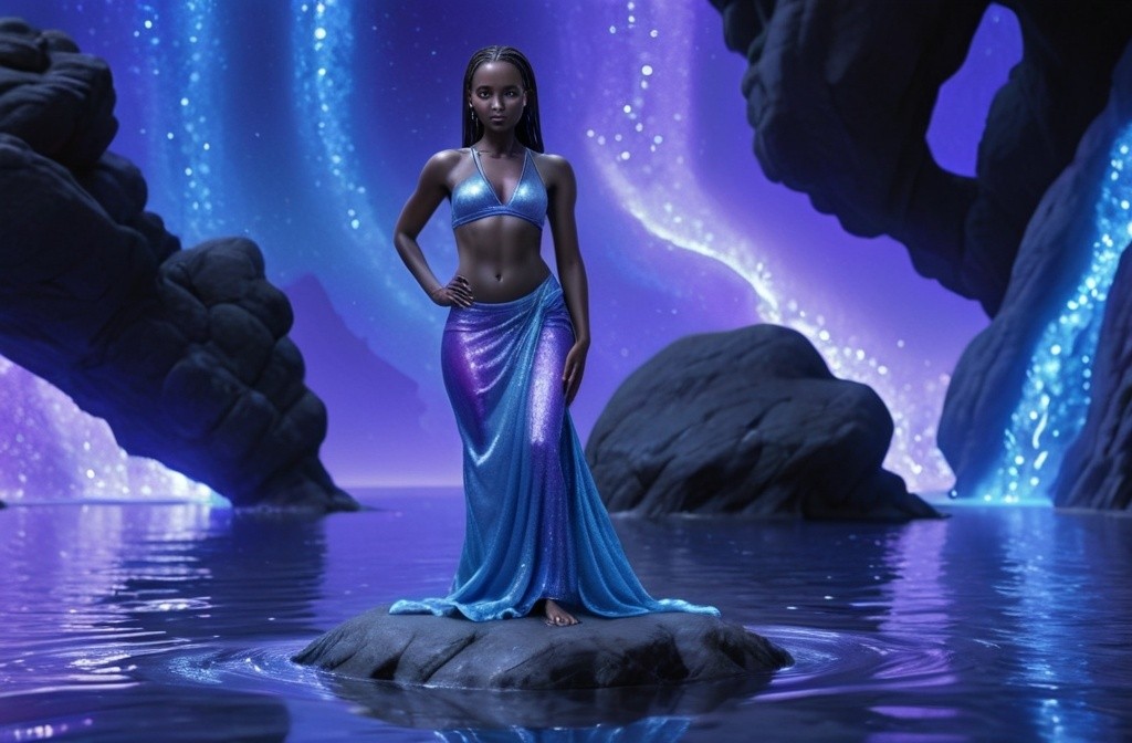 This is a digital CGI image depicting a dark-skinned woman of African Decent with a slender, toned physique, standing on a rocky surface in the middle of a reflective, glowing blue-purple water pool. She is dressed in a shimmering, silver-blue, sequined outfit that includes a midriff-baring top and a long, flowing skirt that reaches the ground. Her outfit catches and reflects the vibrant light around her. She is wearing a small, silver-blue top hat tilted slightly to one side, and her long, dark hair cascades down her back. The woman's arms are raised, and she is casting a magical blue light orb with her right hand, which is glowing intensely. Surrounding her are swirling, luminous blue and purple light patterns, along with sparkling, floating bubbles that add a sense of enchantment. The background is a deep, starry night sky with a gradient from black to dark purple, enhancing the magical atmosphere. The water below her reflects the lights and bubbles, creating a mirror-like effect. The overall style of the image is fantastical and magical, with a focus on vibrant, glowing colors and dynamic light patterns.