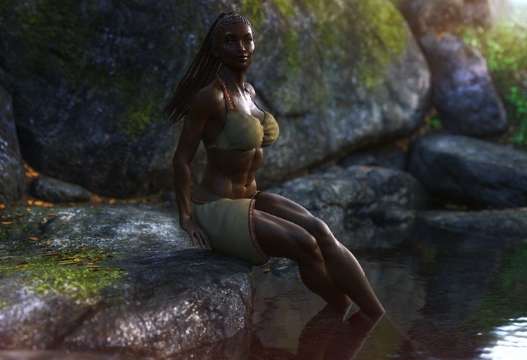 This is a highly detailed CGI rendering of a dark-skinned woman with an athletic, muscular physique, sitting on a moss-covered rock by a serene, shallow stream. She has long, braided hair adorned with small, red beads and is wearing a simple, olive-green bikini top that accentuates her toned arms and defined abs. Her matching bikini bottom is tied at the sides with red strings. Her expression is calm and contemplative, with slightly parted lips and a focused gaze directed slightly to the right. The background features large, smooth rocks with patches of green moss, and the stream's water is clear, reflecting the rocks and greenery. Light filters through the trees, casting dappled sunlight and shadows across the scene, creating a tranquil, natural atmosphere. The textures in the image are highly realistic, from the woman's smooth, glistening skin to the rough, wet surfaces of the rocks and the gentle ripples in the water. The overall color palette includes natural greens, browns, and the warm tones of her skin, contributing to the peaceful, earthy ambiance of the scene.