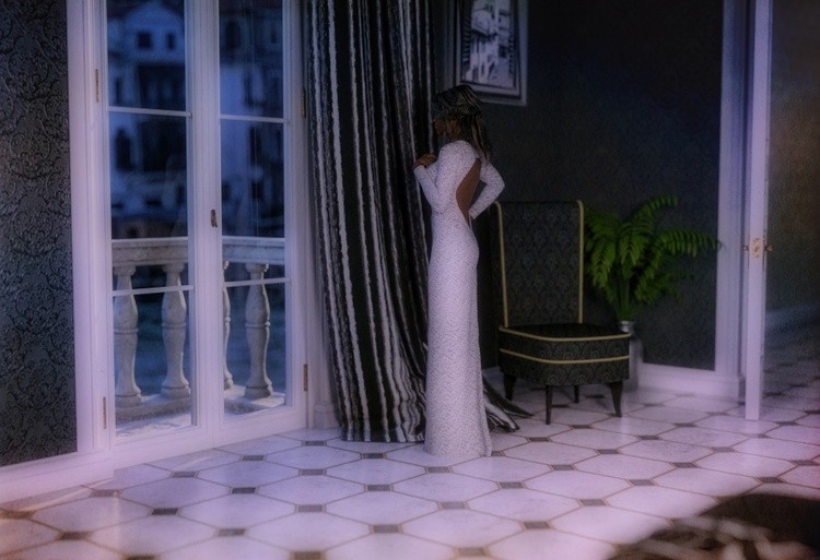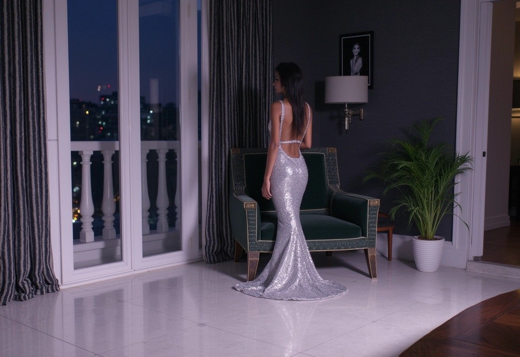 This photograph captures a dark skin woman standing in a dimly lit, elegant room with a modern yet classic interior design. The woman is seen from behind, dressed in a form-fitting, long-sleeved, silver sequin gown that hugs her slender figure and ends at her feet. Her long, dark brown hair is loosely tied back, cascading down her back. She stands near a large window with white frames, partially covered by floor-length, black and white striped curtains. Through the window, a blurred view of an urban nighttime cityscape is visible, with lights from buildings and a balcony with white balustrades. To the right of the woman, there is a dark green upholstered chair with gold trim, positioned against a dark, textured wall. A potted fern plant sits on the floor to the right of the chair, adding a touch of greenery to the room. The floor is tiled with large, white tiles arranged in a diamond pattern. A framed black-and-white photograph hangs on the wall above the chair. The lighting in the room is soft, creating a calm, serene atmosphere, with shadows cast by the window and furniture adding depth to the scene.