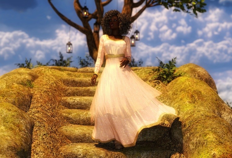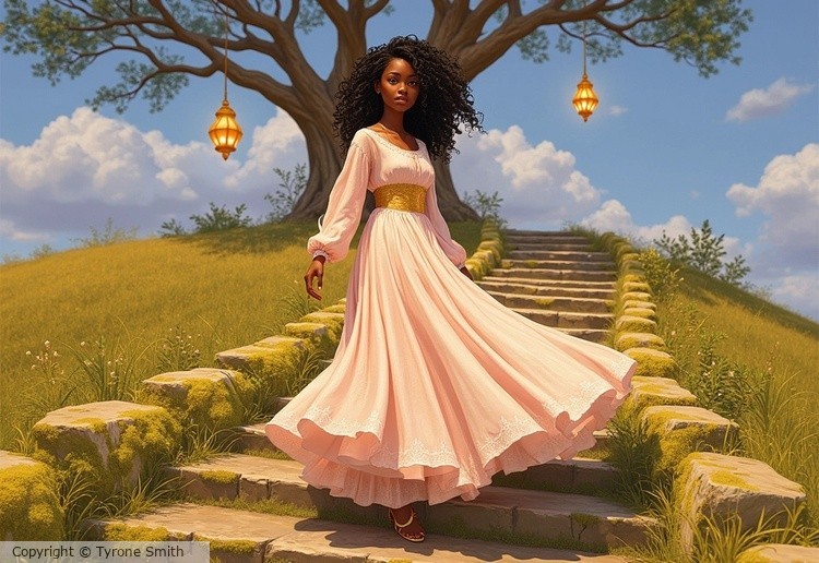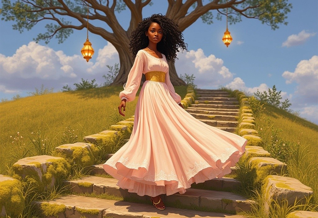 This is a digital illustration depicting a young Black woman with dark brown skin and voluminous, curly black hair standing on a set of stone steps. She is wearing a long, flowing, pale pink dress with long sleeves and a gold waistband, which billows gently in the breeze. Her dress has a delicate, slightly sparkly texture. She stands in the center of the image, looking slightly to her right with a serene expression. The steps she is on are covered in yellowish-green moss, and they ascend from the bottom left to the top right of the image. In the background, there is a clear blue sky with fluffy white clouds and a large tree with a thick trunk and branches extending outward. Hanging from the branches are two small, glowing lanterns that add a warm, magical ambiance to the scene. The overall color palette includes soft pinks, greens, yellows, and blues, creating a dreamlike, whimsical atmosphere. The illustration combines elements of realism with a fantastical, fairy-tale-like quality.