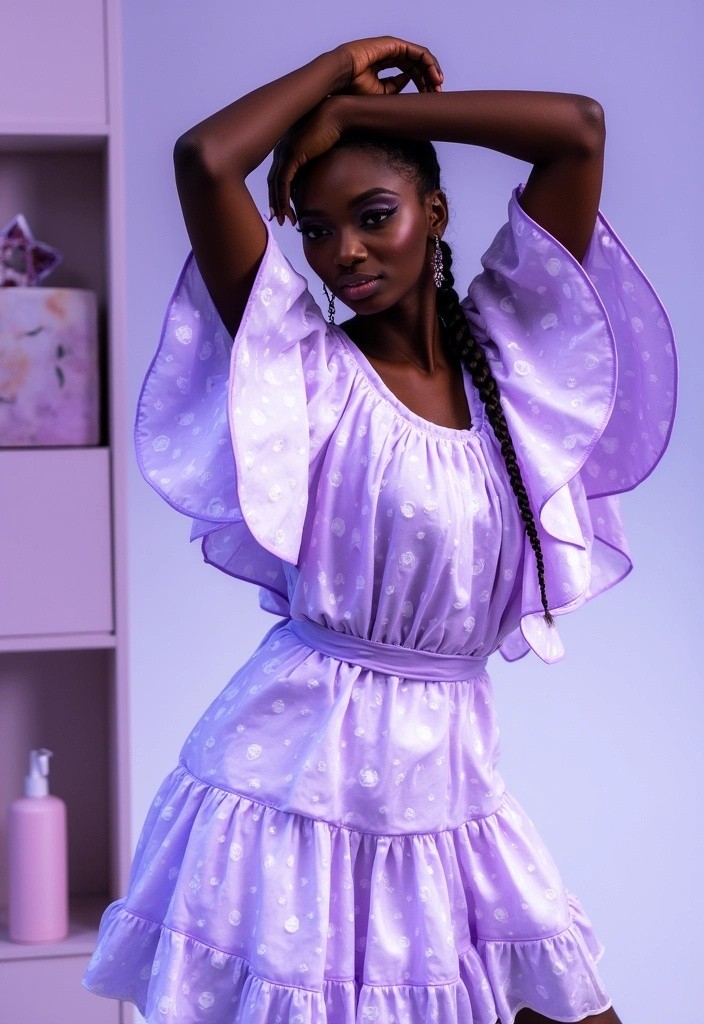 This is a high-quality photograph of a dark-skinned woman with a slender, toned physique and an elegant posture. She is wearing a light purple, semi-transparent, short-sleeved dress with ruffled, puffed sleeves and a fitted bodice that flares out into a layered skirt. The dress features a delicate pattern of small white polka dots and a subtle sheen, giving it a soft, ethereal texture. Her arms are raised above her head, with her right hand resting on her forehead and her left arm bent at the elbow. She has long, braided hair that falls over her right shoulder. Her makeup is subtle, with a focus on her eyes, which are accentuated with dark eyeliner and mascara. She wears small, dangling earrings. The background is a gradient of light to dark purple, adding a dreamy atmosphere to the image. To the left, there is a white shelving unit with a few decorative items, including a star-shaped ornament and a pink bottle. The overall composition is balanced and visually appealing, with the model's pose and the soft, pastel colors creating a sense of grace and elegance. The lighting is soft and even, highlighting the texture and color of the dress.