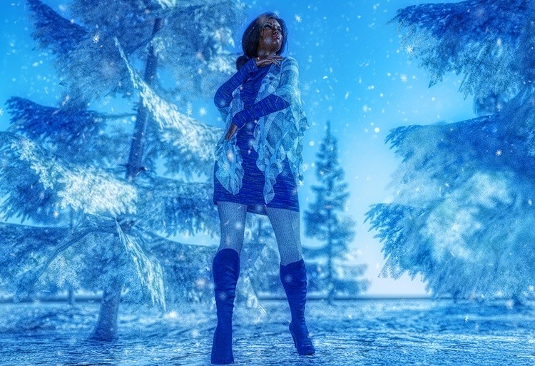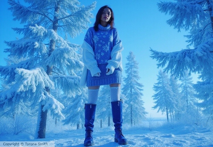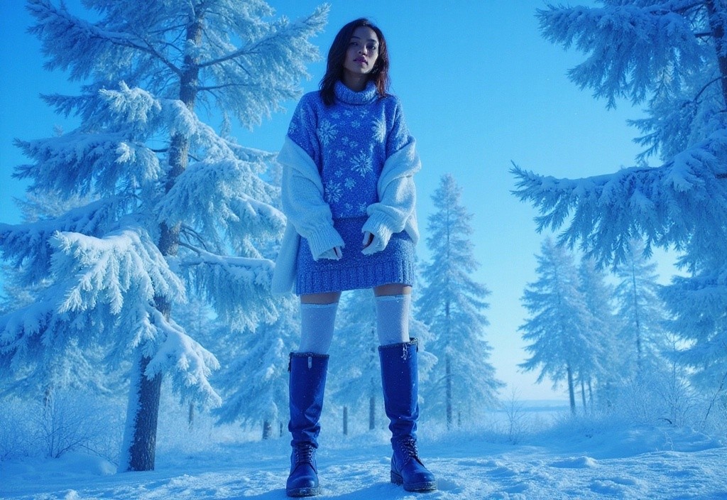 This is a photograph of a dark skin woman of African-American Decent standing in a snowy forest, captured in a surreal, blue-tinted style. The woman is centrally positioned, facing slightly to the right with a confident stance. She has light brown skin and long brown hair that falls over her shoulders. She is wearing a blue, long-sleeve knit sweater with a pattern of white and light blue snowflakes, and wearing a long white shawl with snowflake pattern layered over a dark blue mini dress. Her legs are covered in white fishnet tights, and she is wearing knee-high, blue, fur-lined boots. The background features tall, snow-covered pine trees, with the snowflakes on the branches and ground appearing almost ethereal due to the blue hue and falling from the sky. The ground is covered in a thick layer of snow, and there are small snowflakes gently falling from the sky, adding to the magical atmosphere. The sky is a bright, clear blue, and the overall lighting gives the scene a cool, almost otherworldly glow. The image has a dreamy, fantasy-like quality, enhanced by the blue tint that permeates the entire scene. The woman's expression is calm and serene, adding to the tranquil and enchanting mood of the photograph.