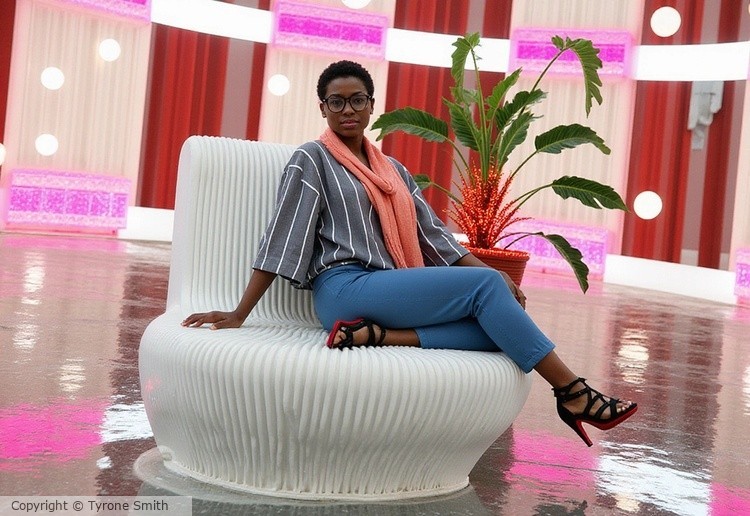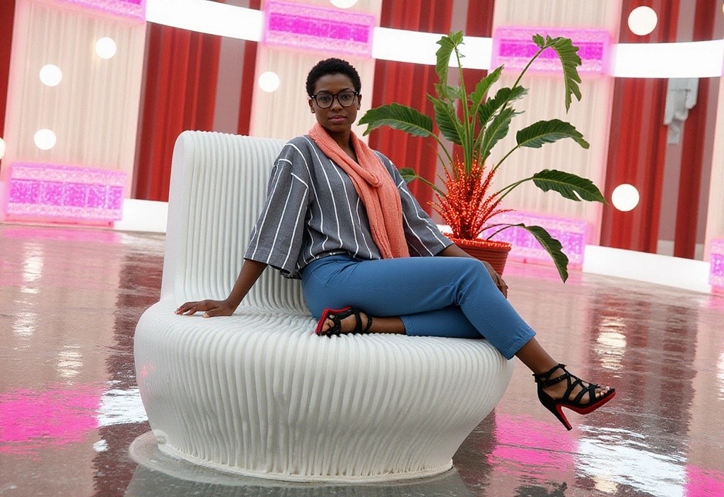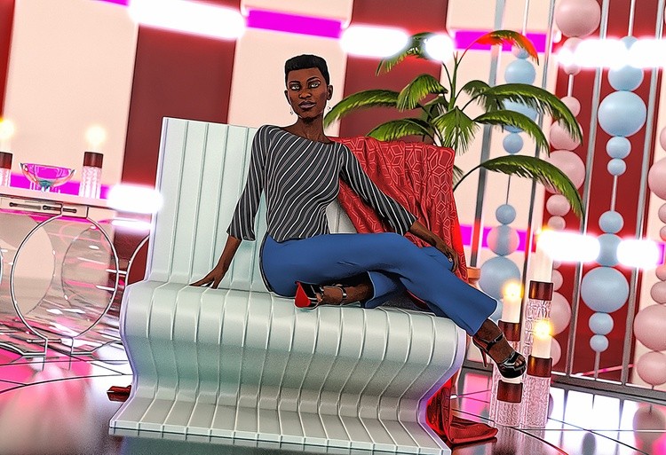 This is a digitally created image featuring a stylish Black woman sitting on a modern, white, ribbed, curved bench in a vibrant, futuristic setting. She has a dark complexion, short black hair, and is wearing glasses with black frames. Her outfit consists of a loose, gray, long-sleeved blouse with white vertical stripes, a coral pink, semi-sheer, knitted shawl draped over her shoulders, and form-fitting, blue, ankle-length pants. She completes her look with black, strappy, high-heeled sandals that have red soles. The background is a visually striking, colorful environment with a mix of red, pink, and white vertical stripes and circular patterns. There are several illuminated, spherical lights in pink and white, adding a neon glow to the scene. To her right, a tall green potted plant with broad leaves adds a touch of nature to the otherwise modern and synthetic setting. The floor is glossy and reflective, mirroring the colorful lights and patterns above. The overall style of the image is contemporary and futuristic, with a blend of fashion and digital artistry. The woman's relaxed yet confident posture and the detailed textures of her clothing and surroundings create a dynamic and engaging composition.