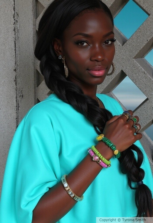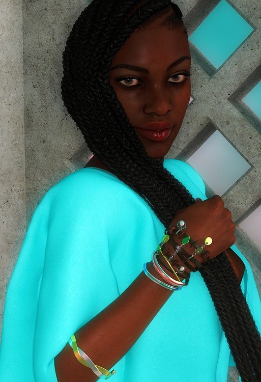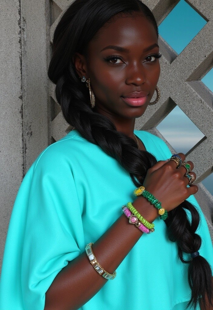 This is a digital CGI image of a young Black woman with dark brown skin and a sleek, athletic build. She has long, tightly braided black hair, styled in a single braid that drapes over her right shoulder. Her face is adorned with subtle, natural makeup, featuring defined eyebrows, long eyelashes, and glossy pink lips. She wears a bright turquoise, loose-fitting top that contrasts with her skin tone. Her right hand, adorned with multiple colorful bangles and rings, is holding her braid. The rings have various designs, including green and yellow stones. The background consists of a textured, gray concrete wall with a pattern of square cutouts, allowing light to filter through. The lighting in the image is soft, highlighting her facial features and the vibrant color of her top. The overall style of the image is modern and vibrant, with a focus on the subject's confident and stylish appearance. The textures of the braids, clothing, and background elements are highly detailed, adding depth and realism to the digital artwork.