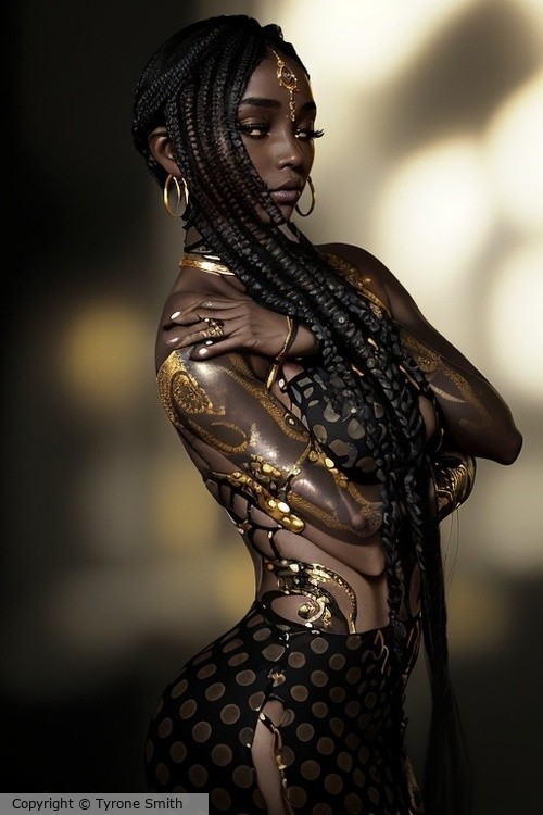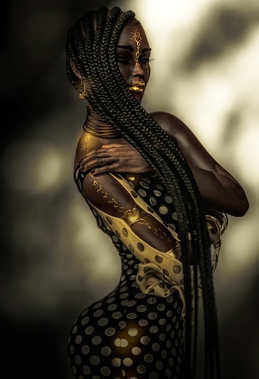 This is a highly detailed, digital photograph of a dark-skinned woman with a striking, elegant presence. She has long, intricately braided hair that falls over her right shoulder and back. Her skin is smooth and glowing, with a golden sheen accentuating her features. She is wearing a form-fitting, black and gold polka dot dress that clings to her curvaceous figure, has a golden tattoo on her arm, and has a golden lip gloss on. highlighting her hourglass shape and full hips. The dress is semi-sheer, revealing a gold underlayer that matches the gold accents on her skin, including a gold decorative line running from her forehead down to her lips and another along her right shoulder. She has gold hoop earrings and her eyes are closed, adding to the serene and regal atmosphere of the image. Her right arm is crossed over her chest, with her left hand resting on her right arm, creating a graceful, self-possessed pose. The background is a blurred, dark, and moody gradient of greys and blacks, which contrasts with her luminous skin and golden accessories, making her the focal point of the photograph. The overall style of the photograph is modern and artistic, with a focus on elegance, beauty, and cultural aesthetics.