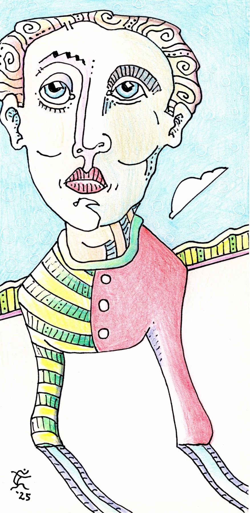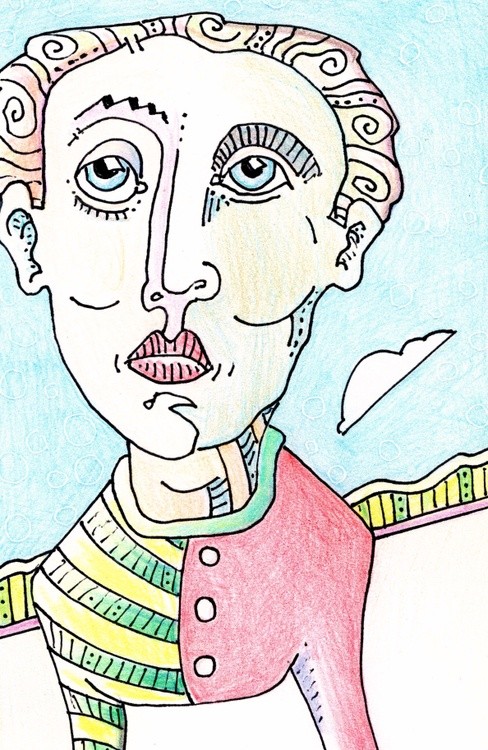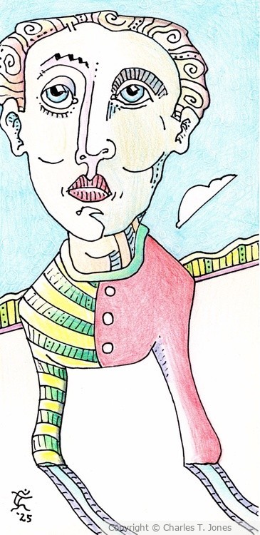 My characters lately have been similar yet different---like us. It's something to think about, if thinking is something found in your wheelhouse. This is an 8.5 by 4.125 gel pen with color pencil drawing on heavyweight acid-free paper. Original Jones Art is still plugging away in northwest Austin, Texas.
