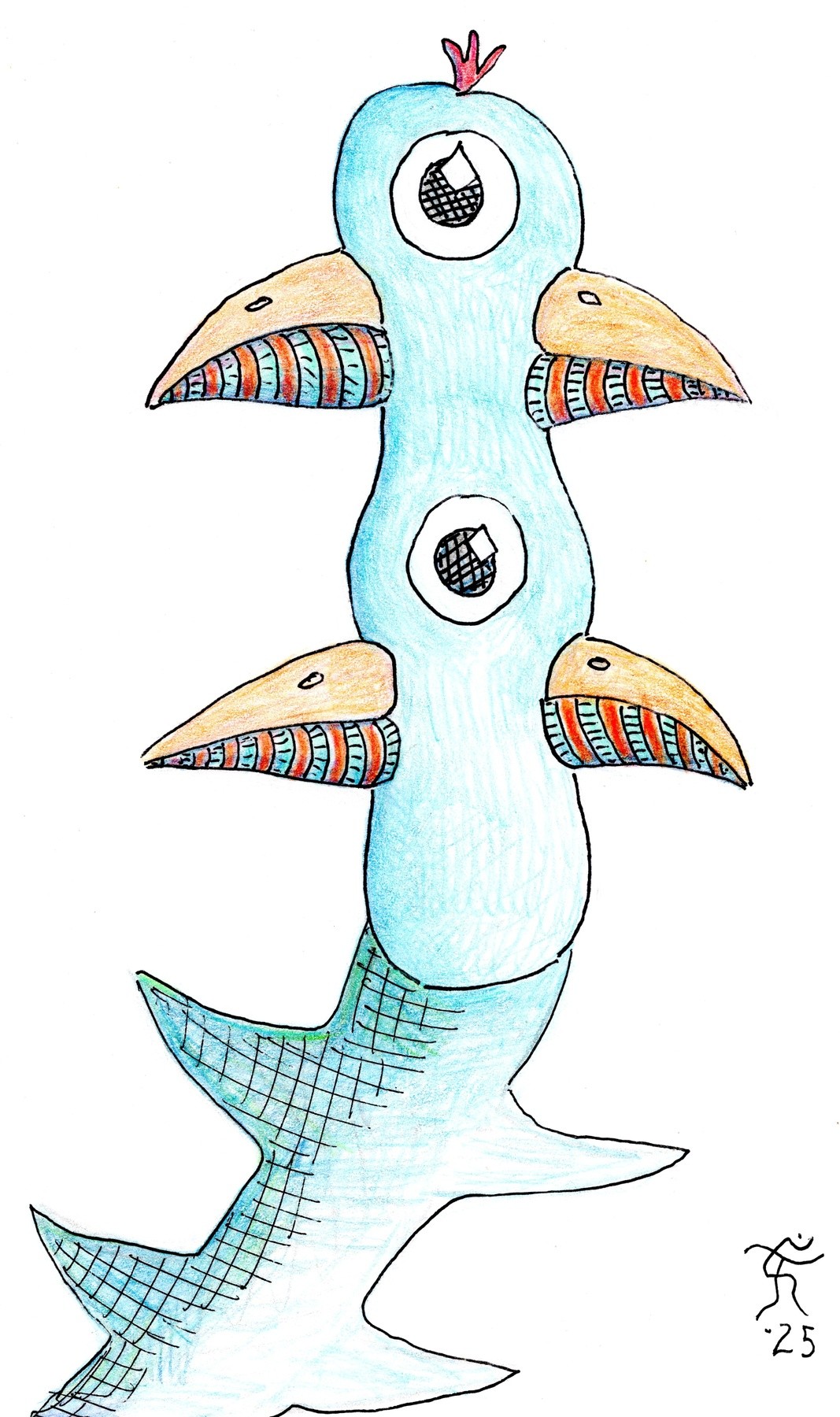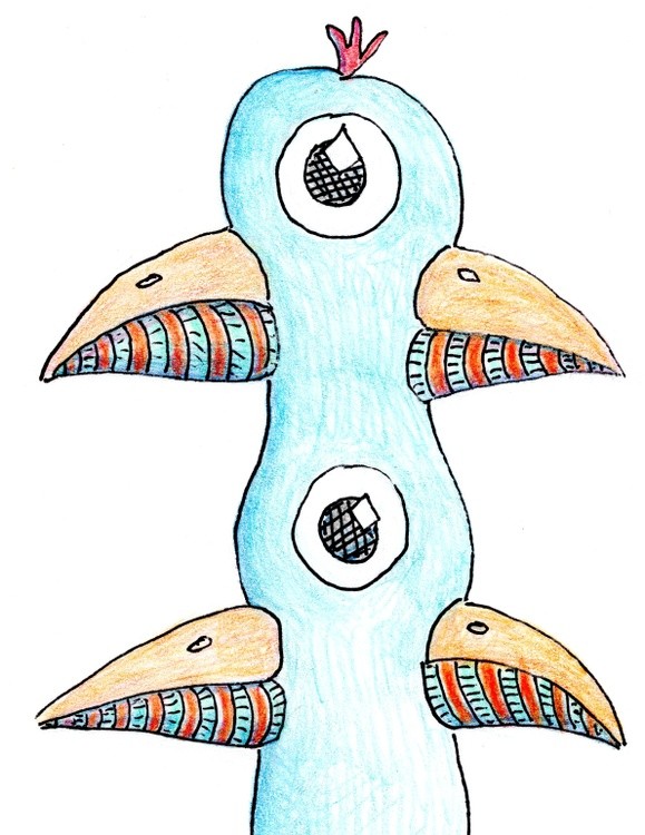 Several years back I did both a drawing and an acrylic painting of an image with three beaks. I called it 'Triple Speak' with a reference to 1984's 'double-speak.' I was fiddling with ideas for another 3D piece and this one popped up with four beaks. It could have been 'quadruple speak' but I then settled on 'Beak Up' which sort of ties in to the original concept. I might not get this made during the winter months, but I can start it. This is an 8.5 by 5.5 inches gel pen with color pencil drawing on regular bond paper. It's something to upload the day before Thanksgiving here in northwest Austin, Texas.
