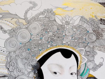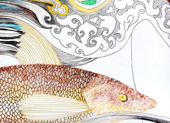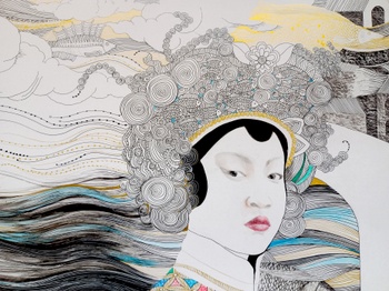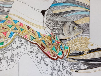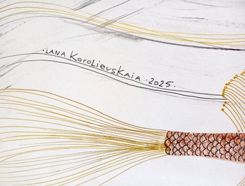 The work depicts a female figure intertwined with a natural element through the rhythm of lines and fluid graphic structures. The headdress of an Eastern beauty is woven from numerous fish. Waves transforming into clouds form a continuous stream in which the fish move — symbols of depth, memory, and inner knowledge. The half figure acts as a mediator between different levels of the world: water, sky, and earth. Her calm, focused gaze holds this multilayered reality in balance. Detailed graphics, delicate linework, and the choice of accent colors — gold, turquoise, and red — create a sense of quiet strength and constant movement. “Keeper of Currents” presents a guardian figure who maintains the connection between past and present, between natural and human realms. The work explores the idea of an inner current as a form of memory and as a state in which the world regains its wholeness.